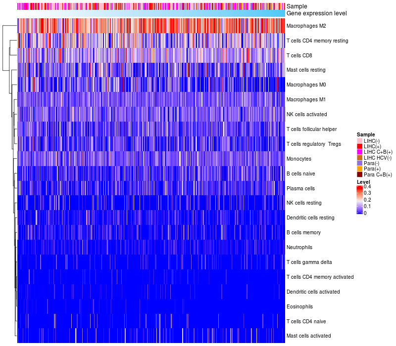 Liver hepatocellular carcinoma HCV (HBV+)(86), Liver hepatocellular carcinoma HCV (HBV-)(19), Liver hepatocellular carcinoma (HBV+)(209), Liver hepatocellular carcinoma (HBV+)(60), Paracancerous HCV (HBV+)(4), Paracancerous (HBV-)(28), Paracancerous (HBV+)(18) |