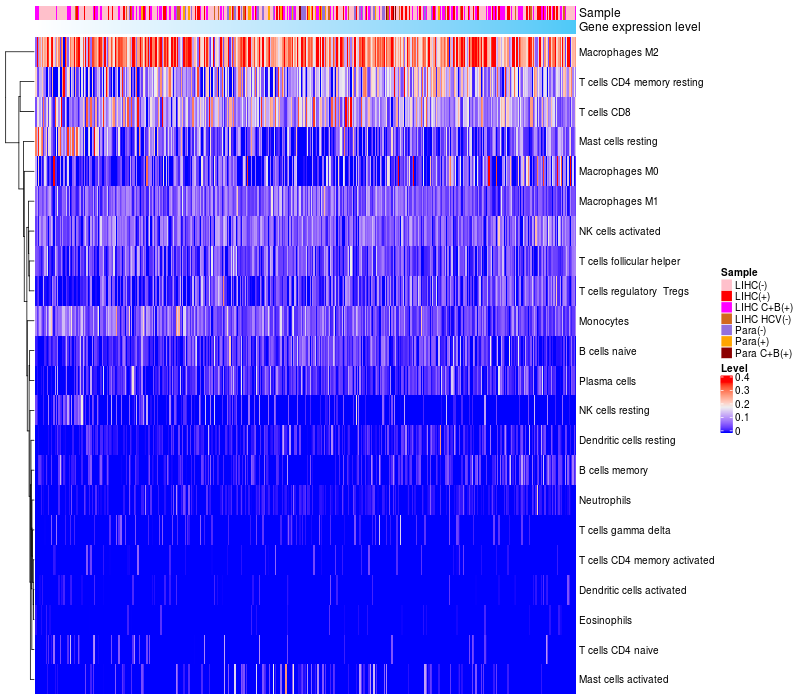 Liver hepatocellular carcinoma HCV (HBV+)(86), Liver hepatocellular carcinoma HCV (HBV-)(19), Liver hepatocellular carcinoma (HBV+)(209), Liver hepatocellular carcinoma (HBV+)(60), Paracancerous HCV (HBV+)(4), Paracancerous (HBV-)(28), Paracancerous (HBV+)(18) |