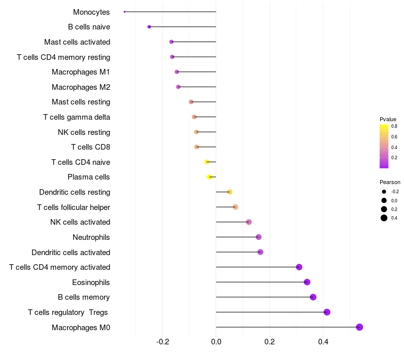 Lollipop of OBSCN expression and immune infiltrating cell level correlation result in HBV+ samples