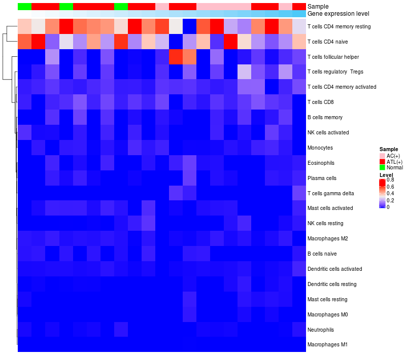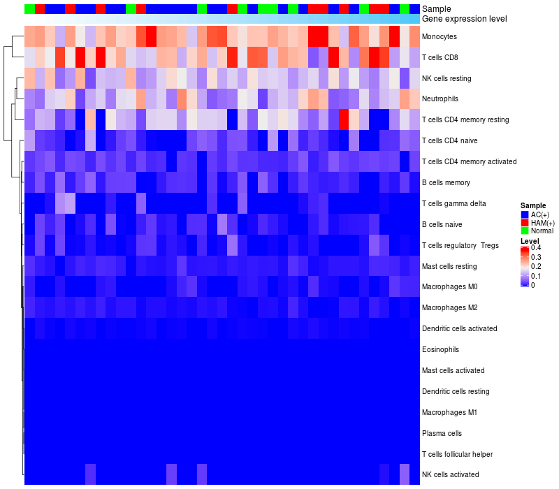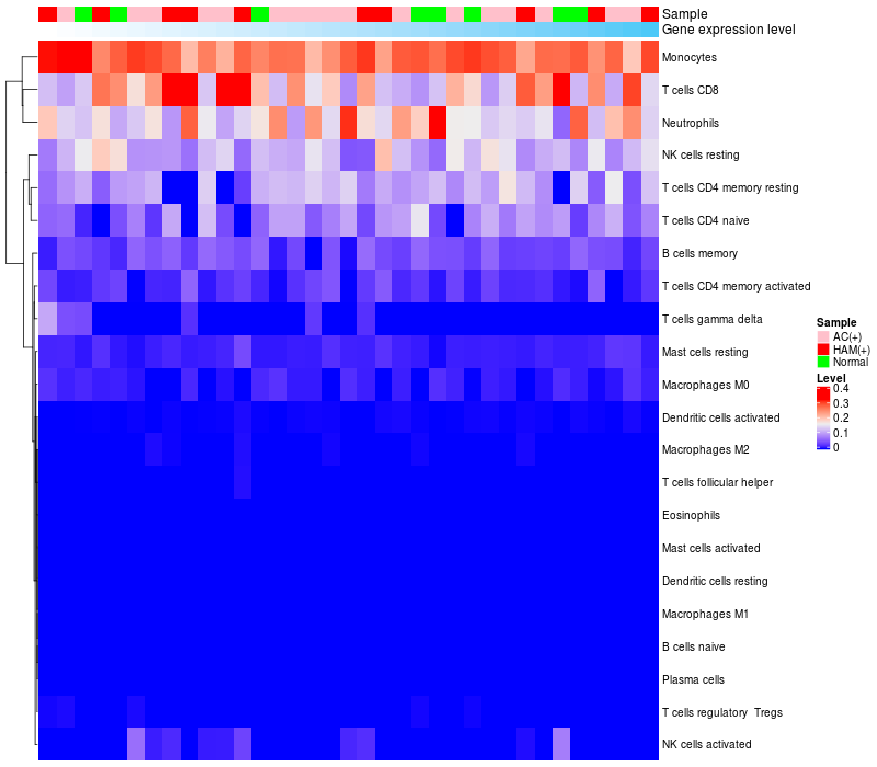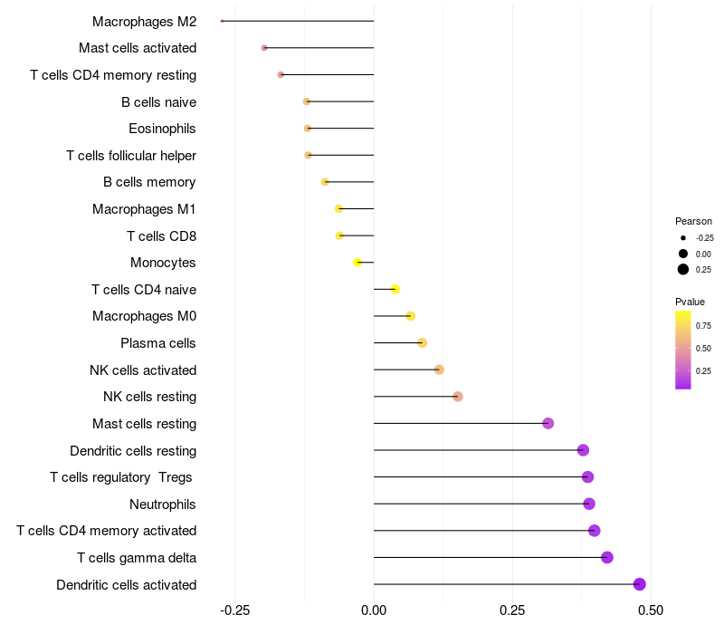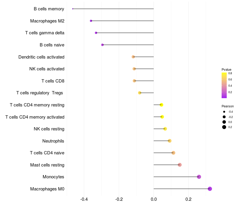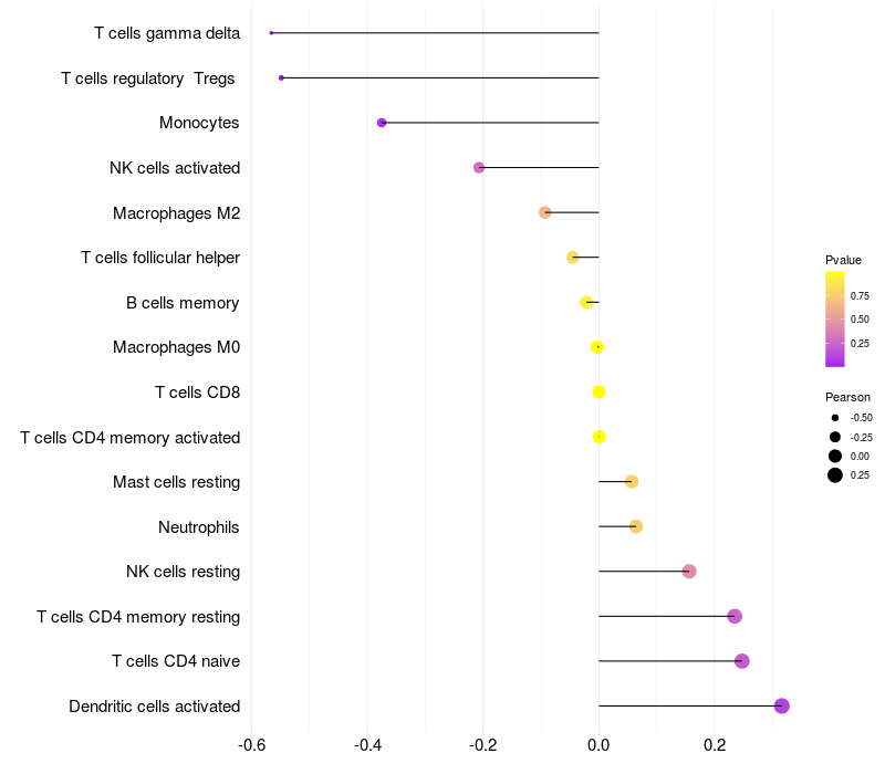 Lollipop of OCIAD1 expression and immune infiltrating cell level correlation result in HTLV1+ samples
