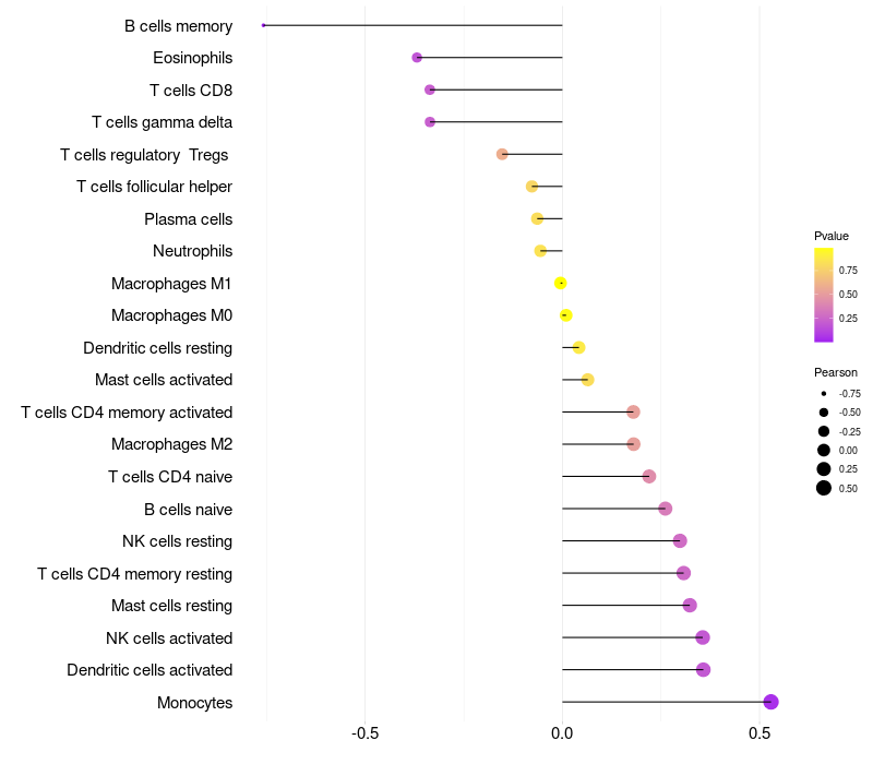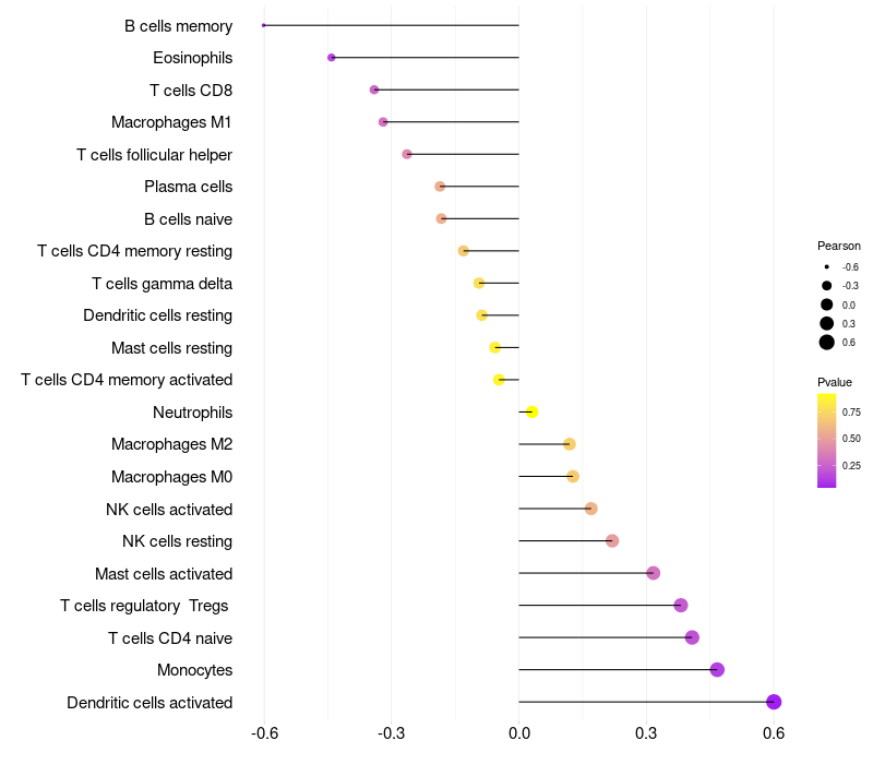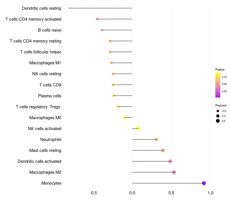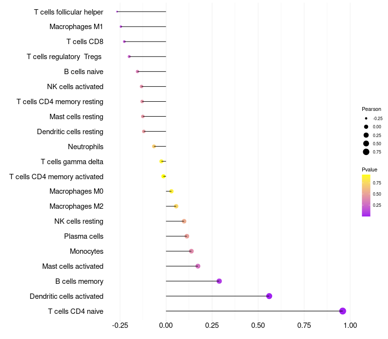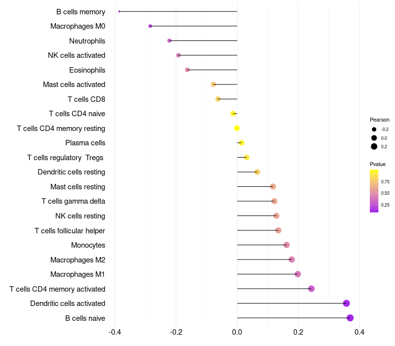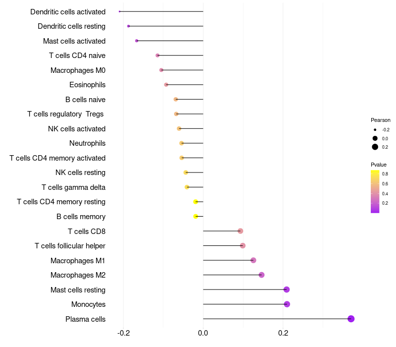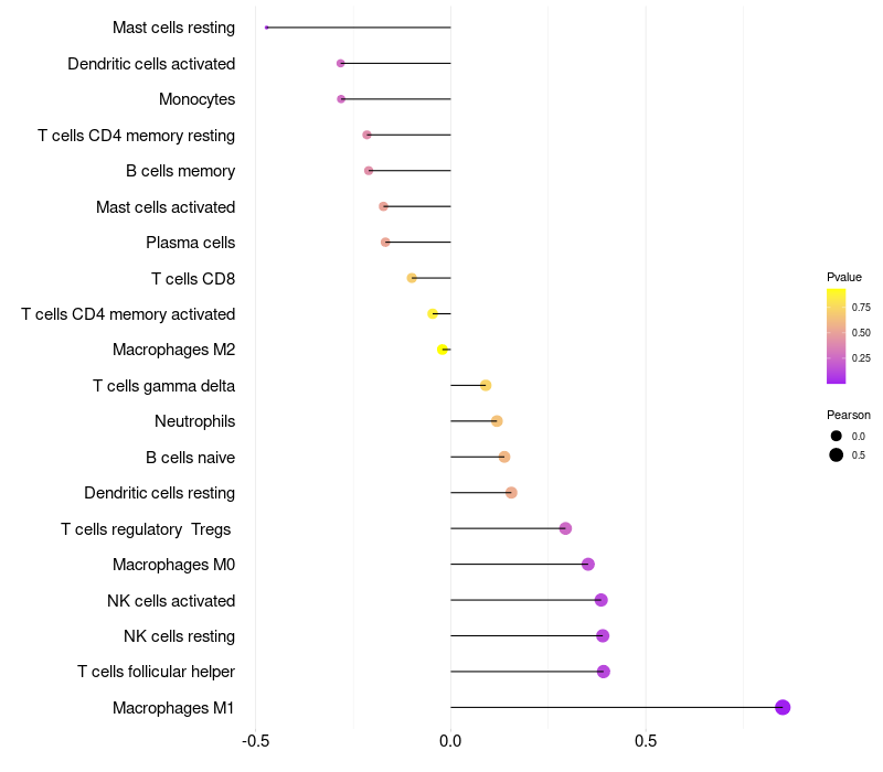 Lollipop of OLFM4 expression and immune infiltrating cell level correlation result in HPV+ samples