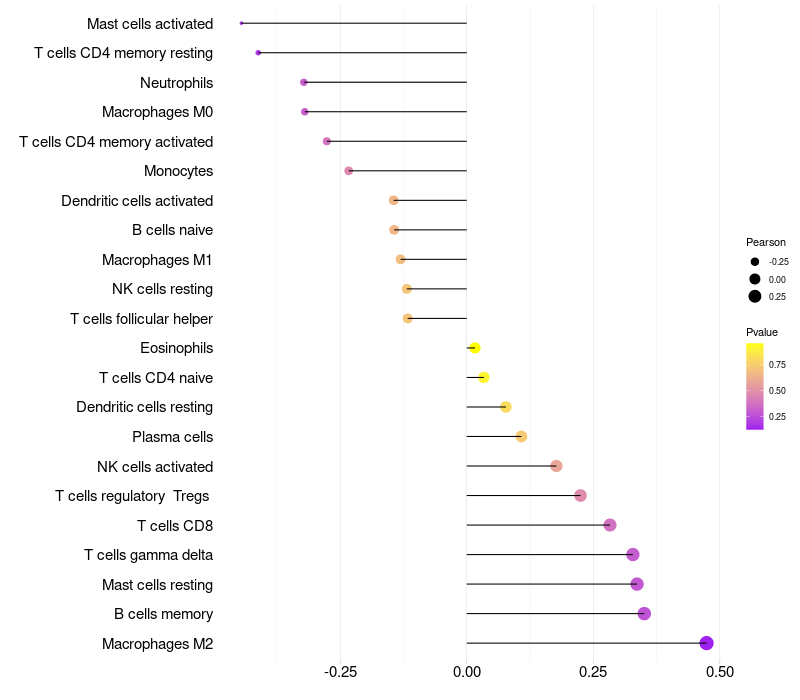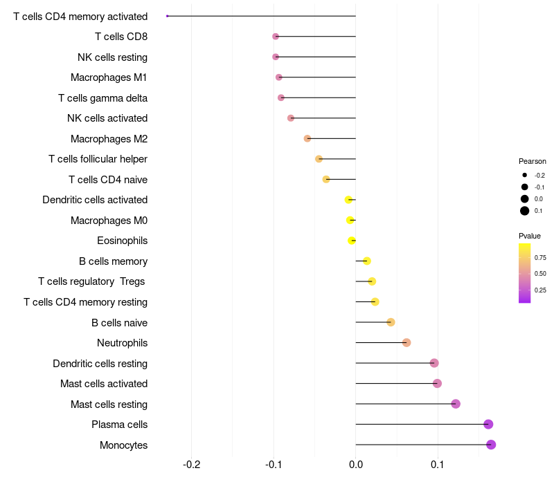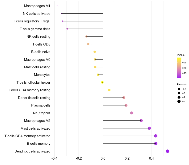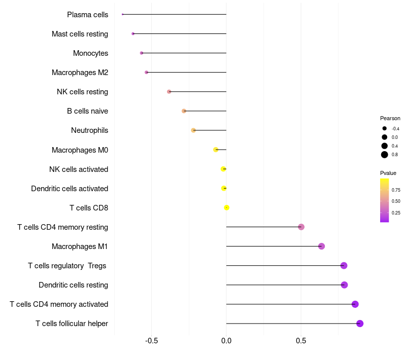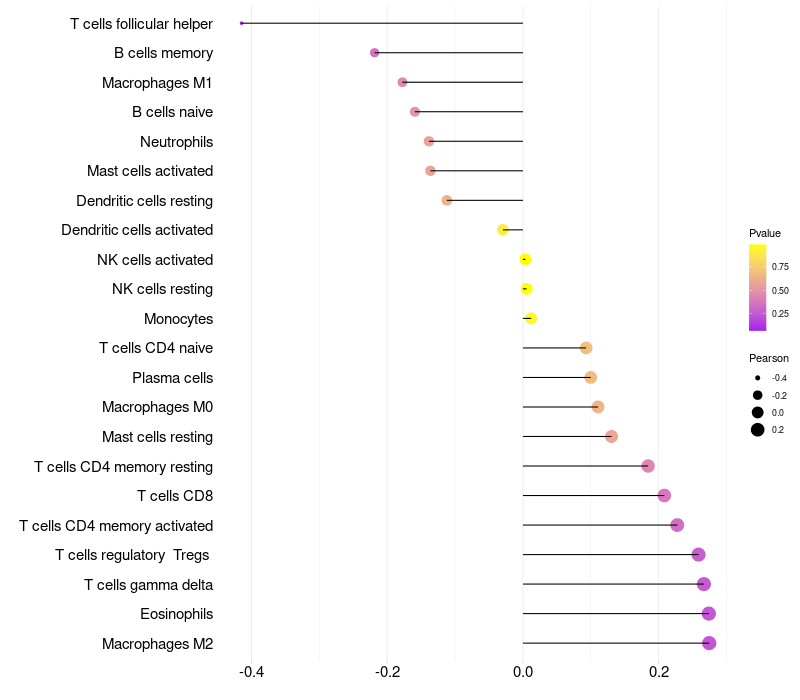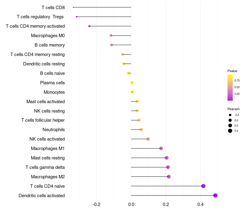 Lollipop of ONECUT1 expression and immune infiltrating cell level correlation result in HPV+ samples