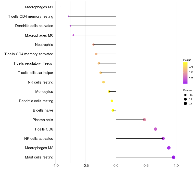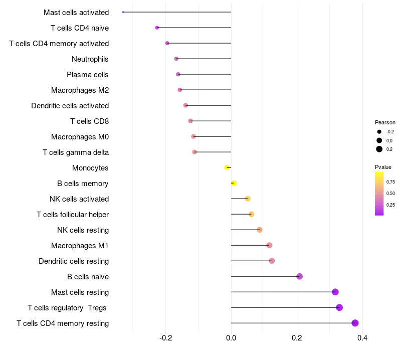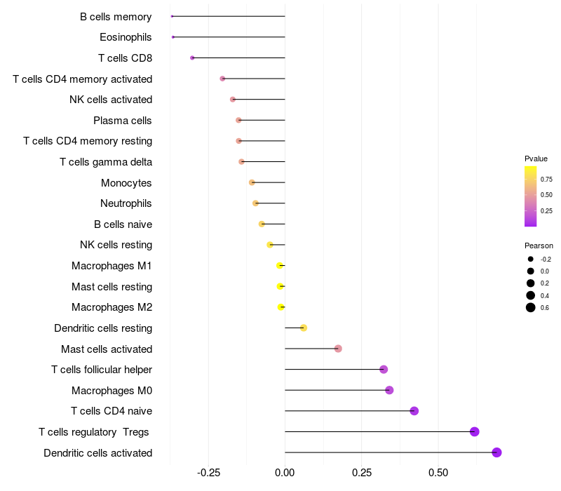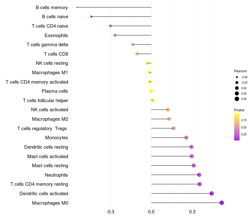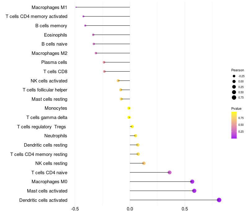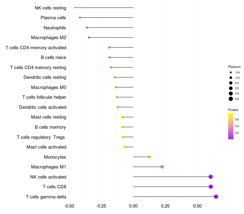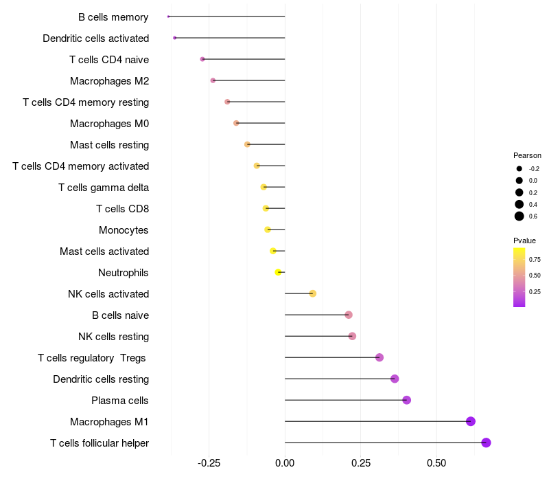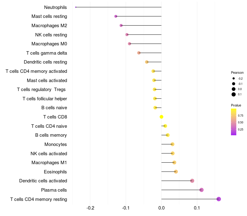 Lollipop of OPHN1 expression and immune infiltrating cell level correlation result in HPV+ samples