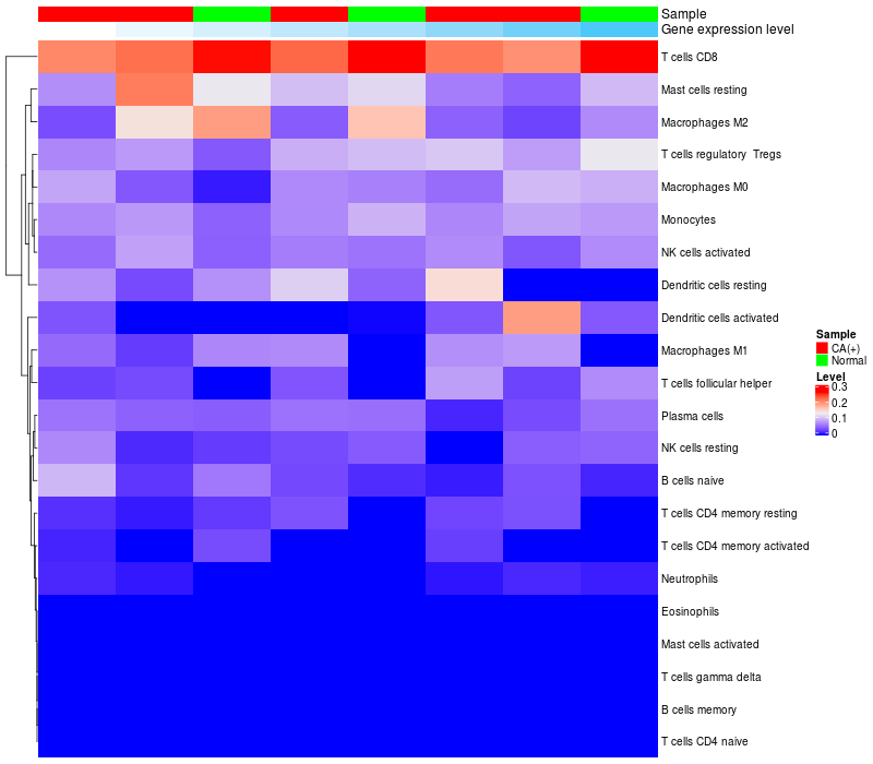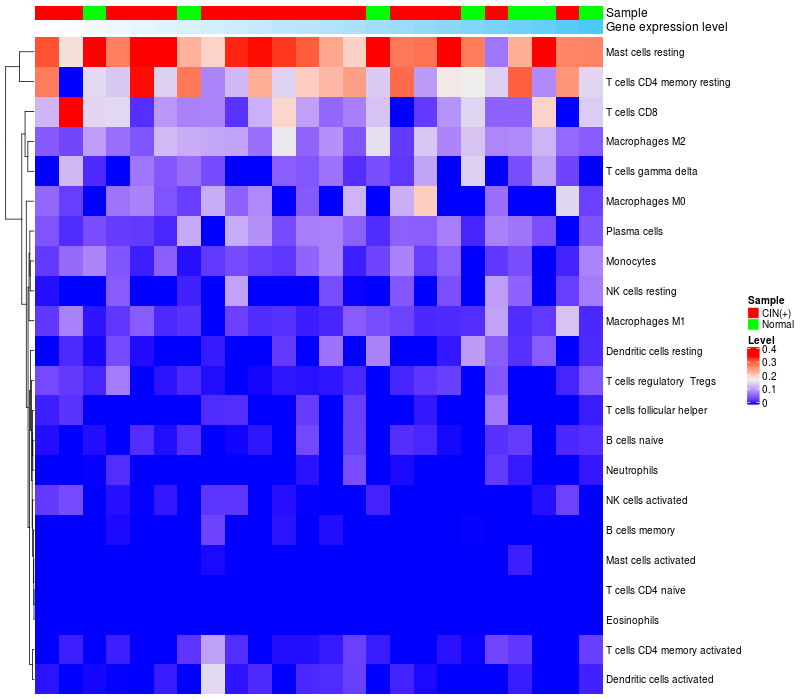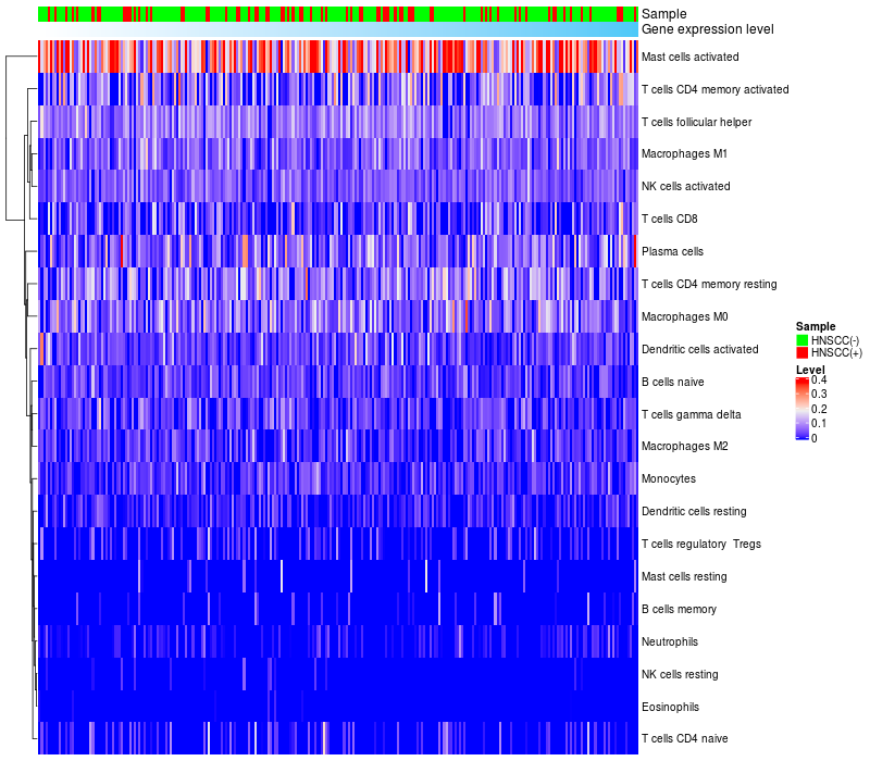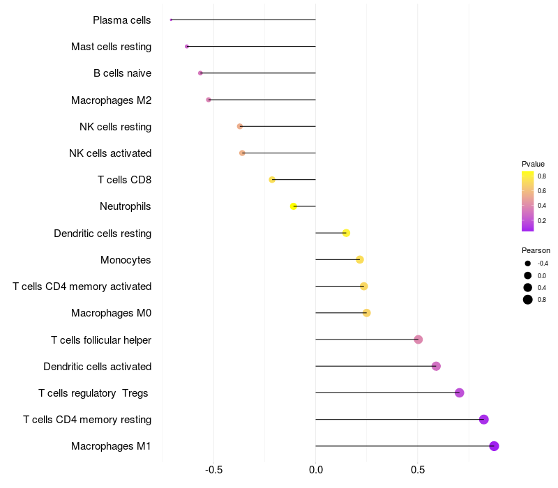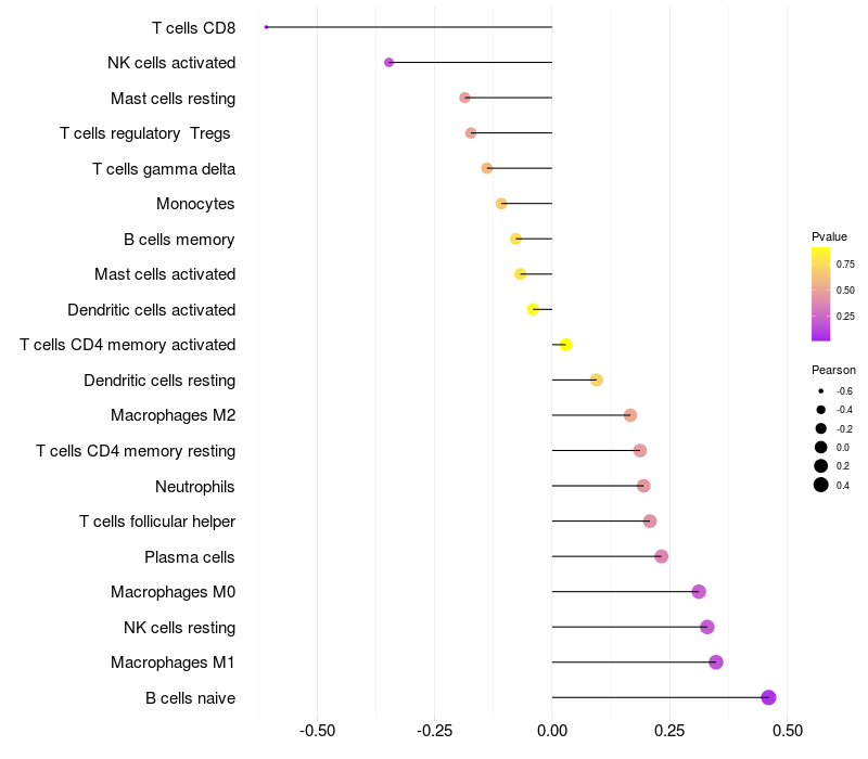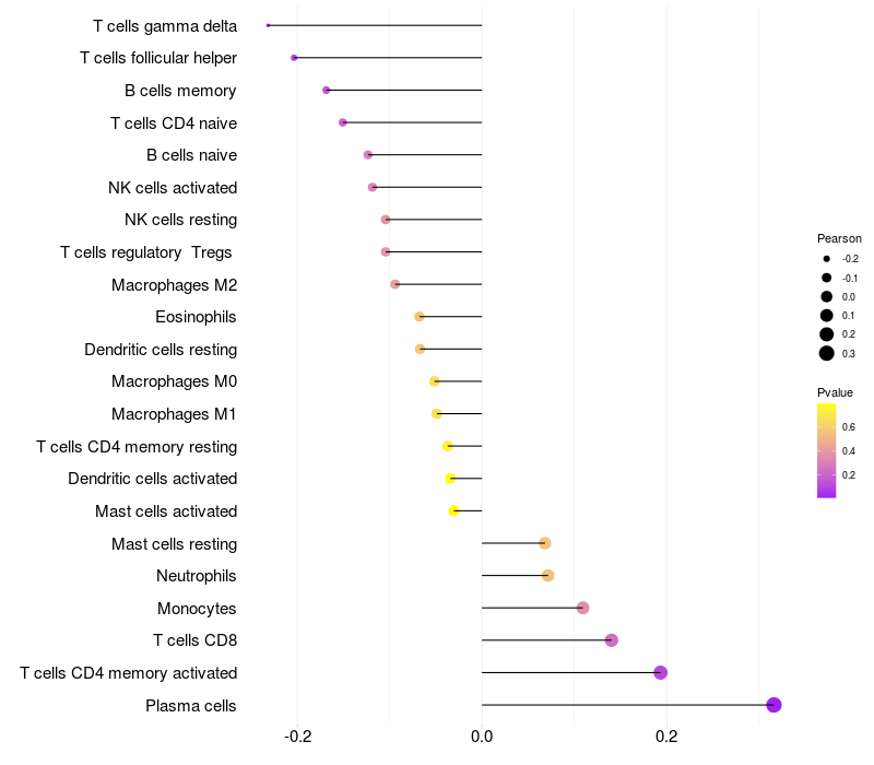 Lollipop of OR11H1 expression and immune infiltrating cell level correlation result in HPV+ samples
