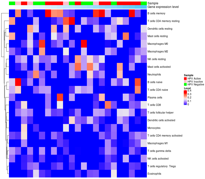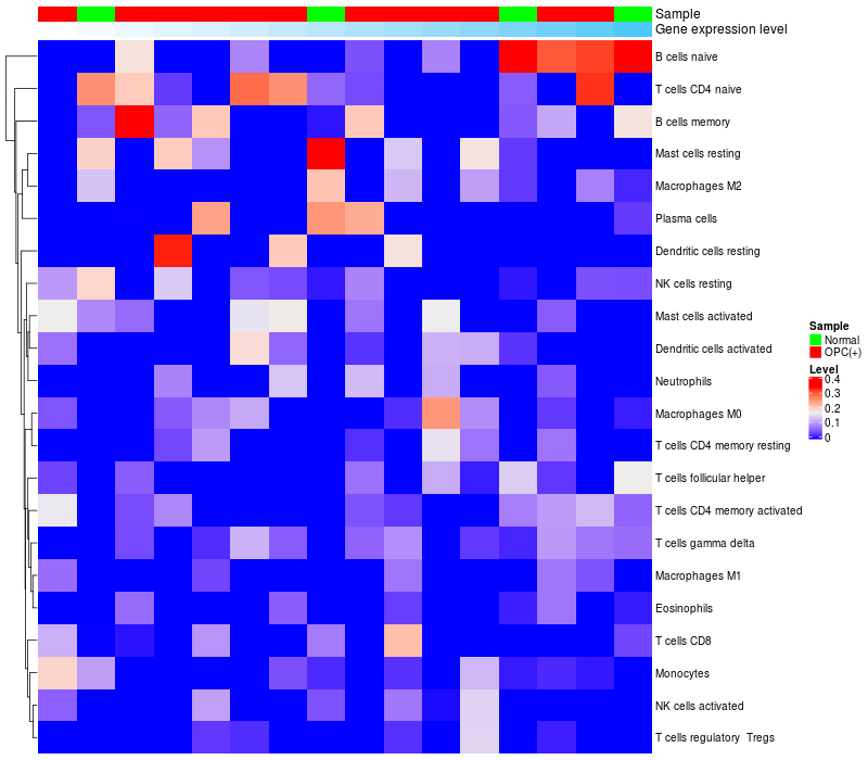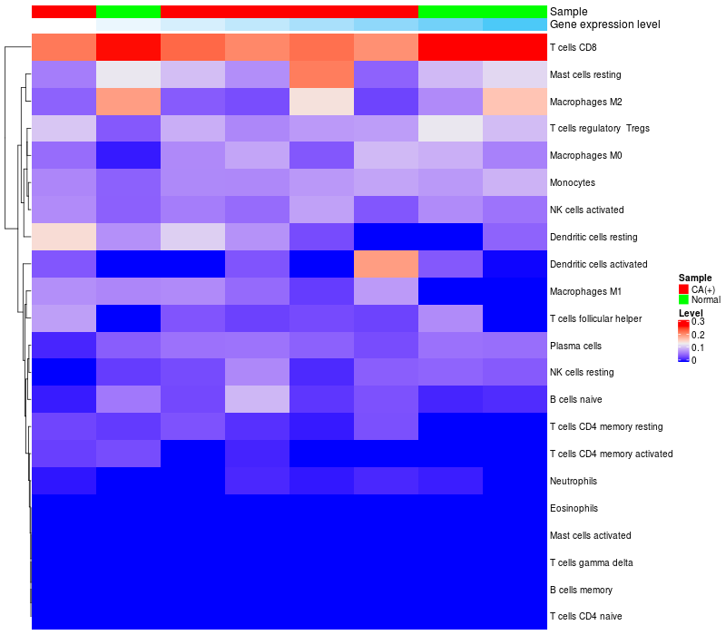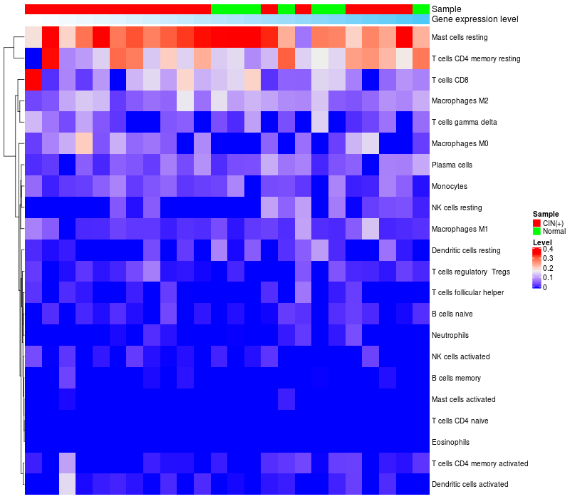 • Left: Heatmap of target gene expression and the level of various types of immune cells (cell type fractions) in all samples based on CIBERSORT method.