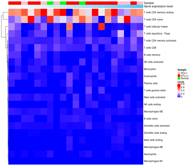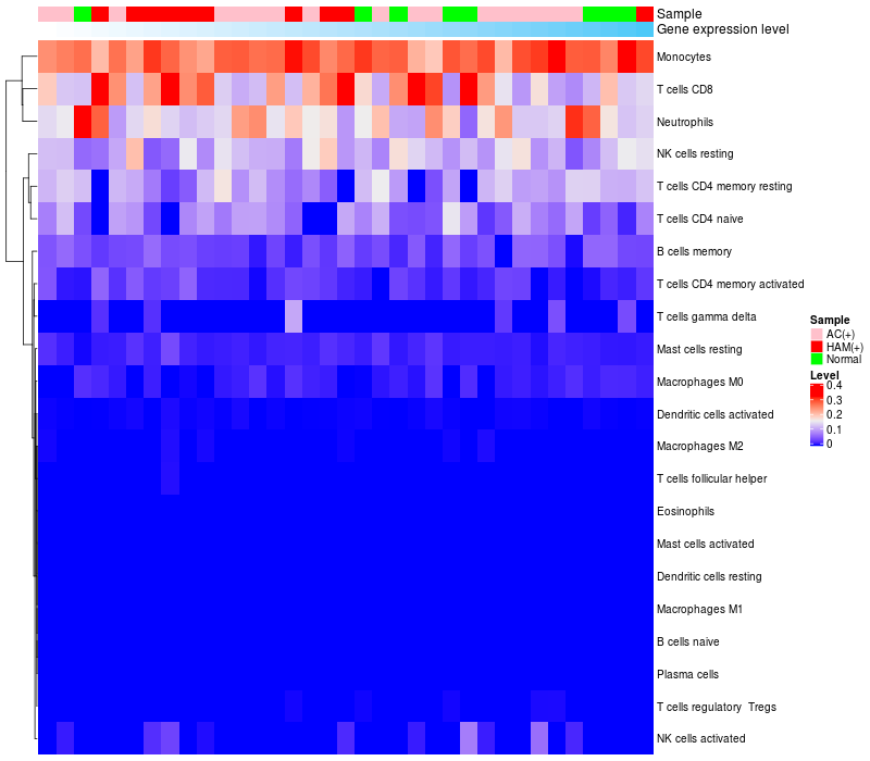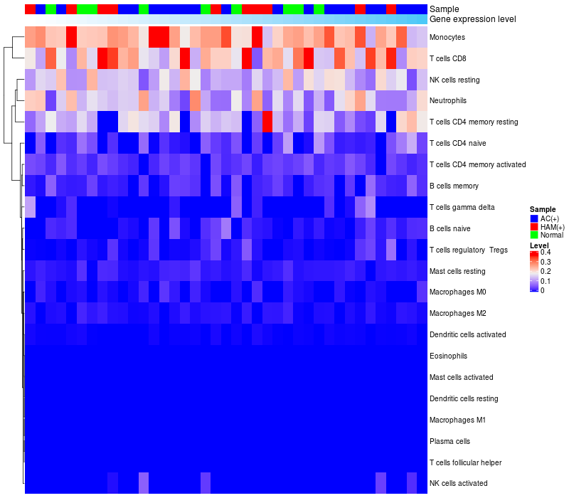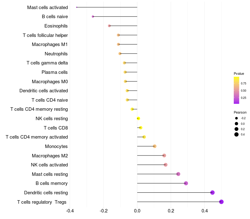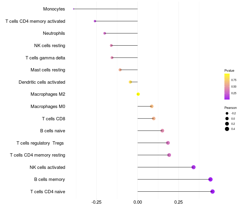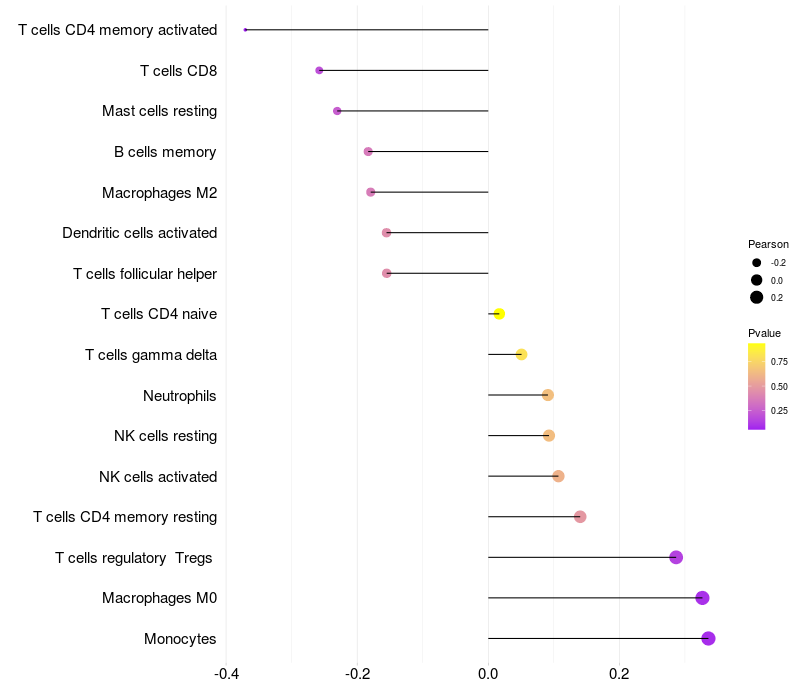 Lollipop of OR1B1 expression and immune infiltrating cell level correlation result in HTLV1+ samples