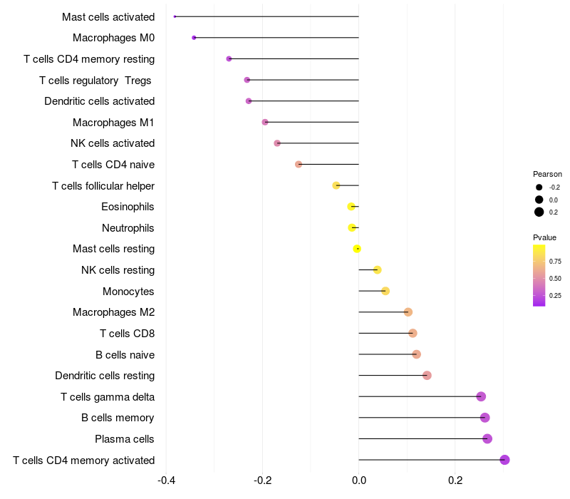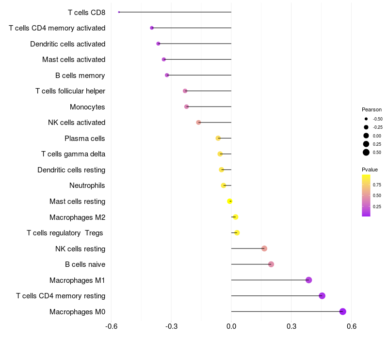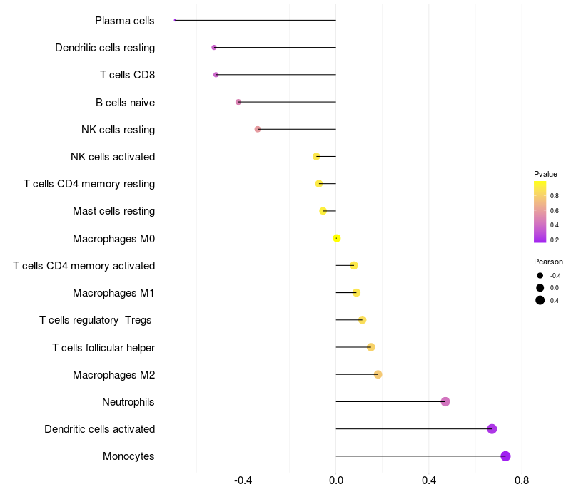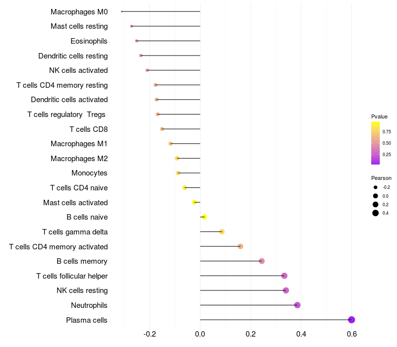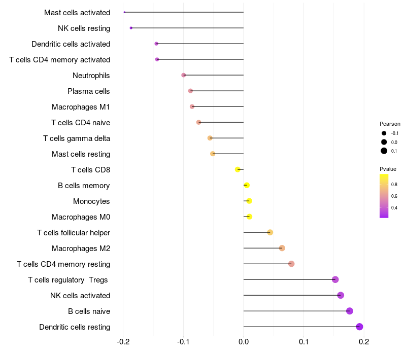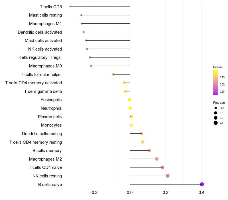 Lollipop of OR1M1 expression and immune infiltrating cell level correlation result in HPV+ samples