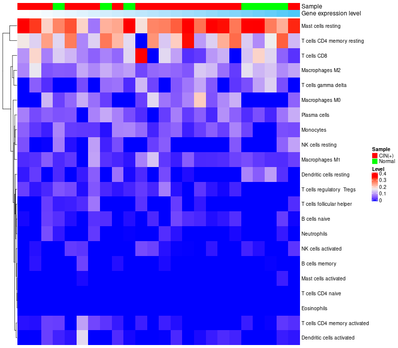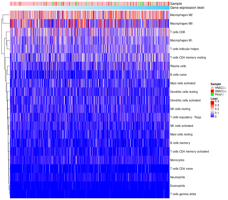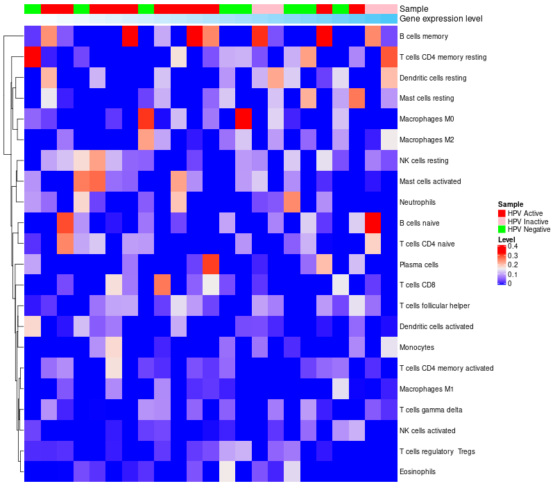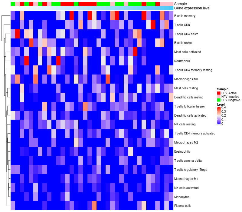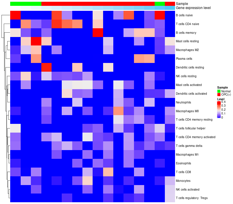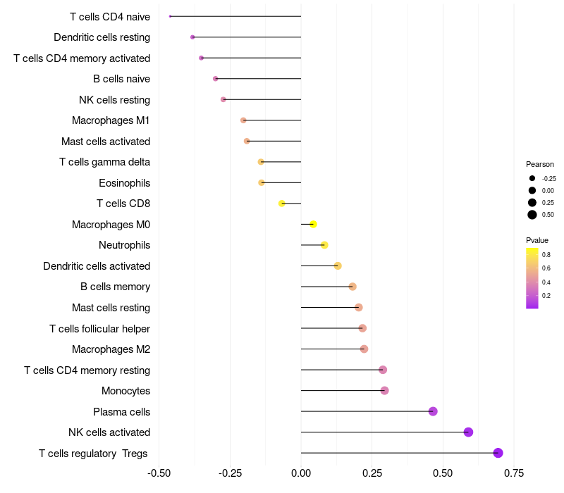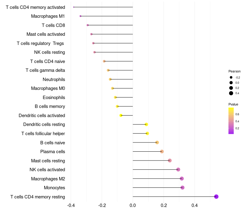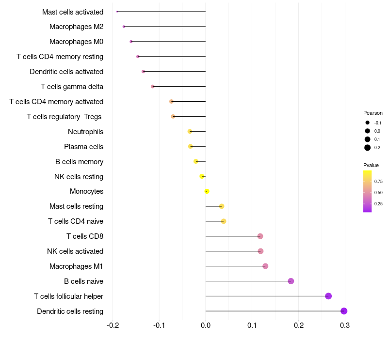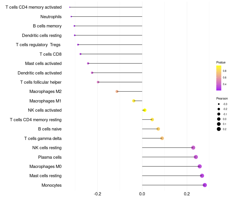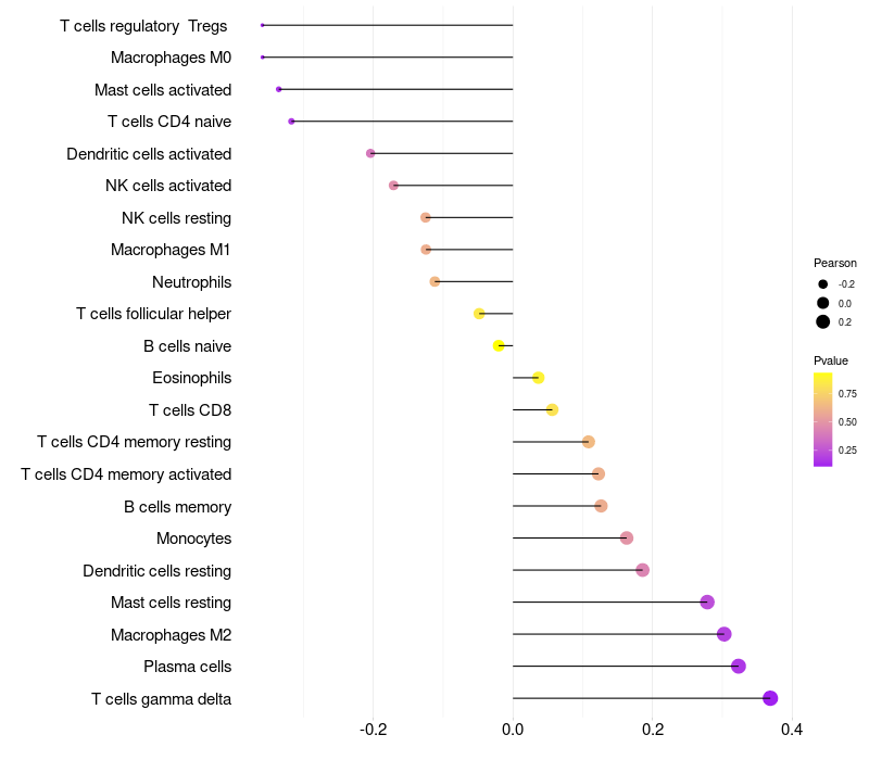 Lollipop of OR2C1 expression and immune infiltrating cell level correlation result in HPV+ samples