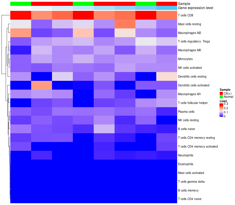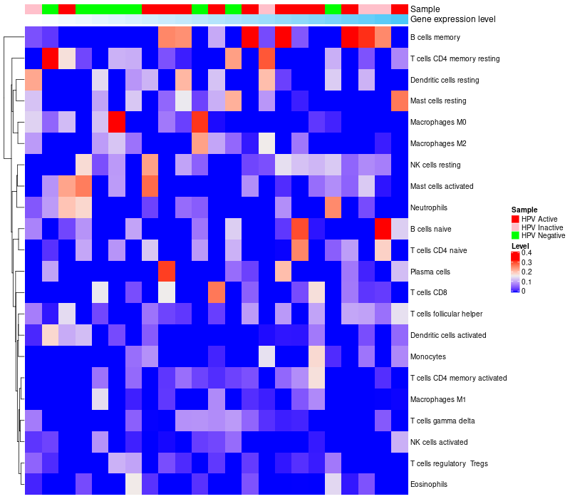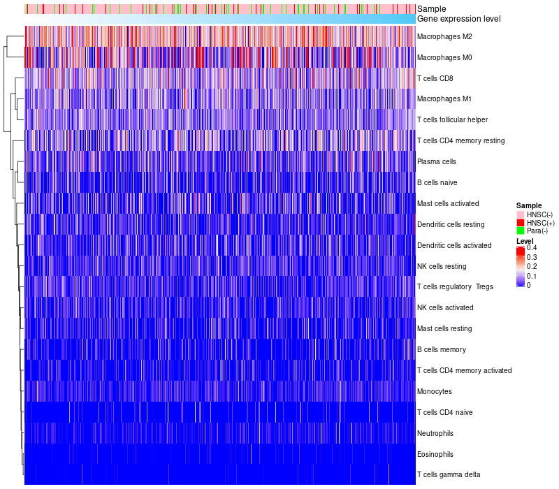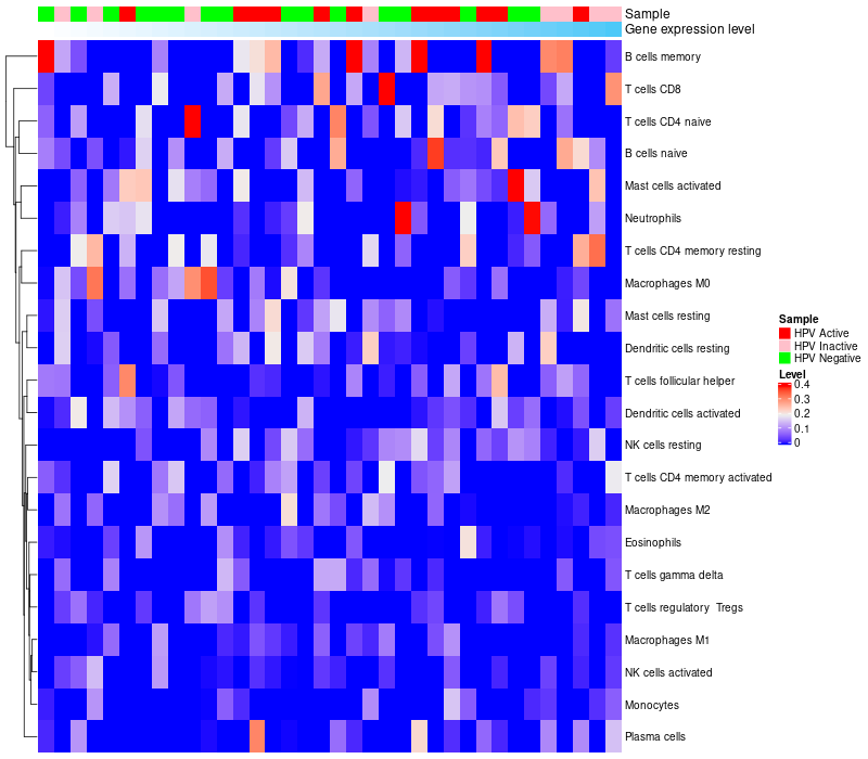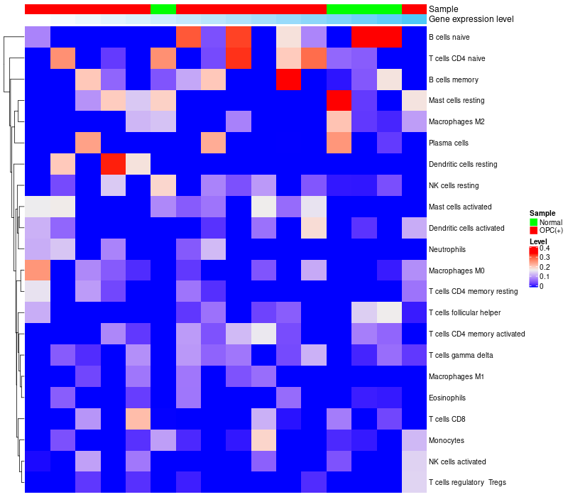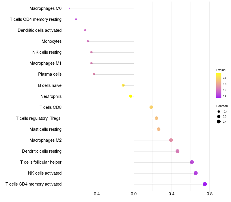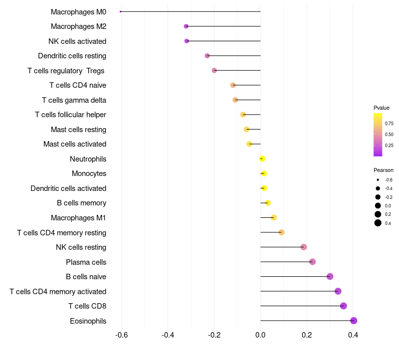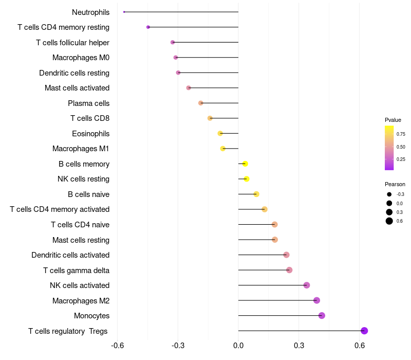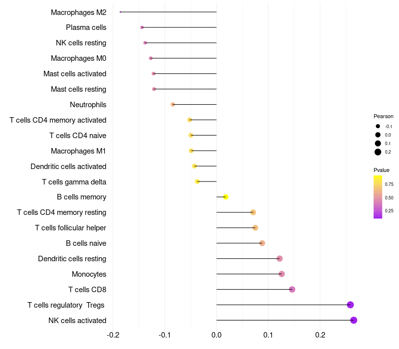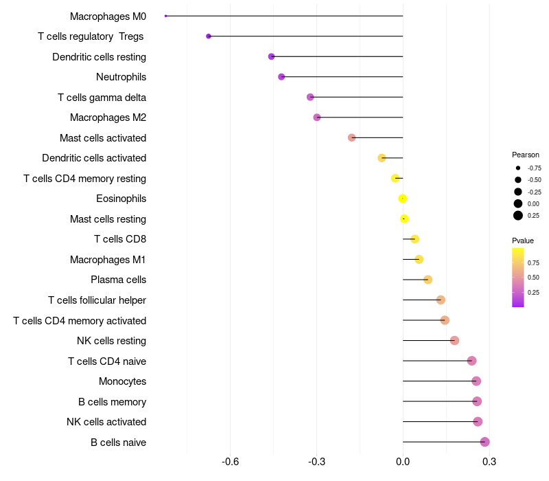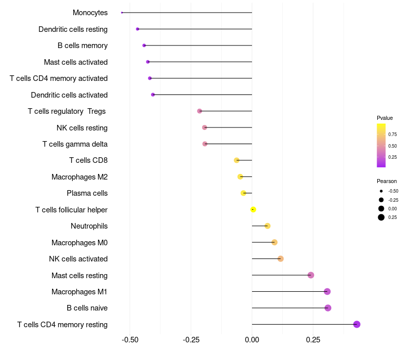 Lollipop of OR5C1 expression and immune infiltrating cell level correlation result in HPV+ samples