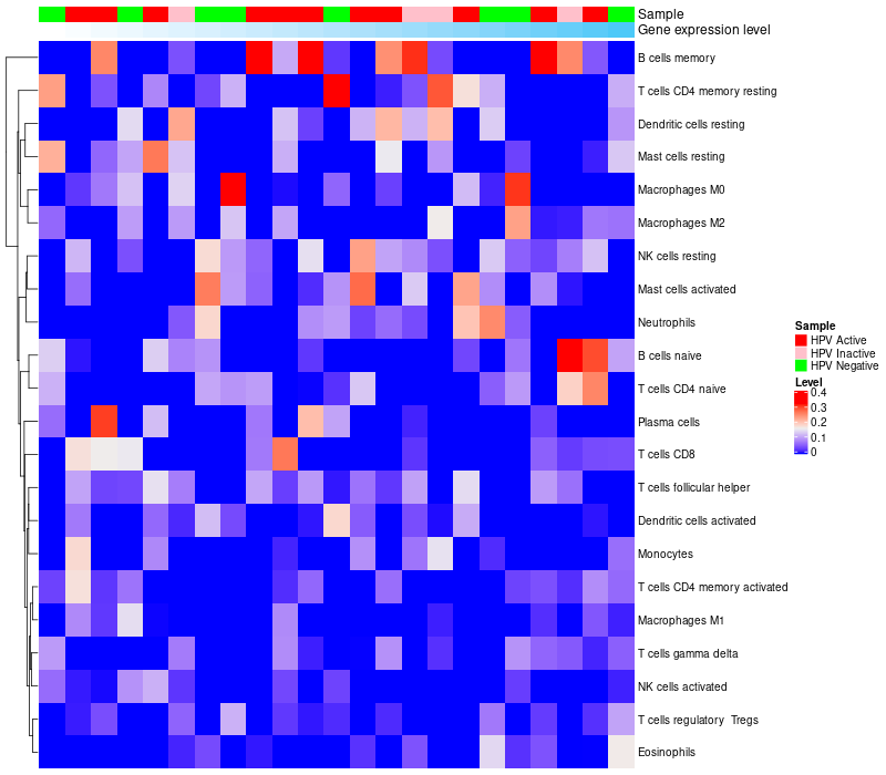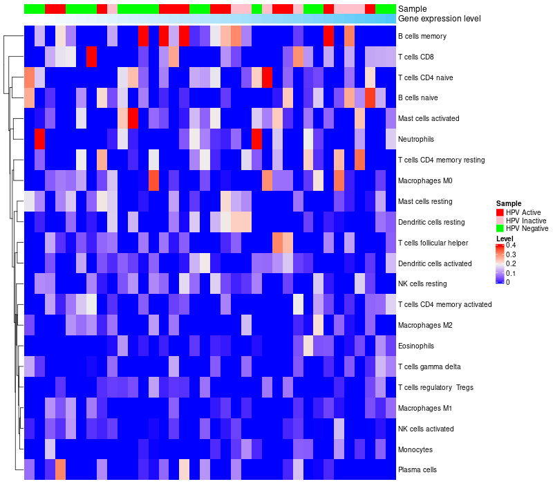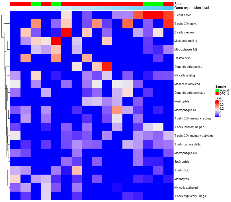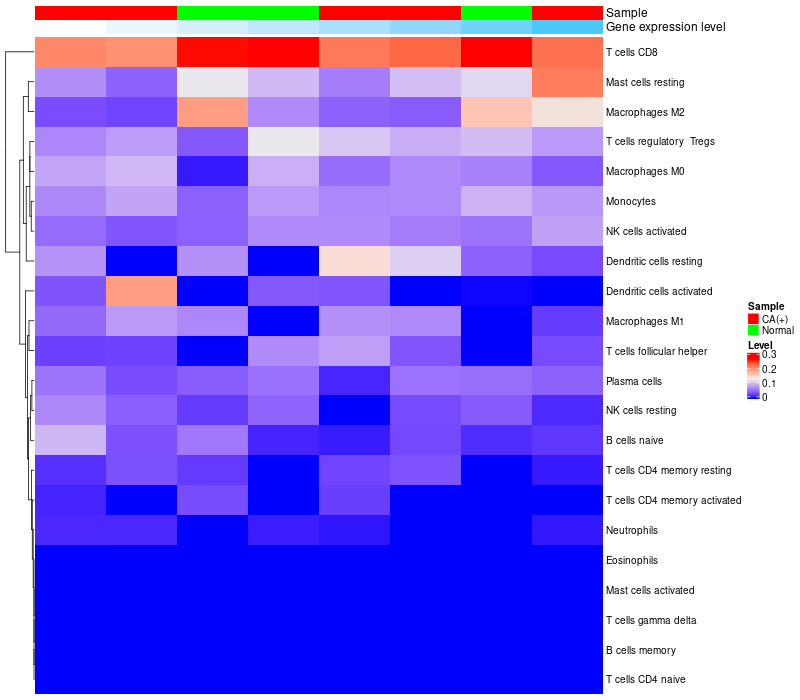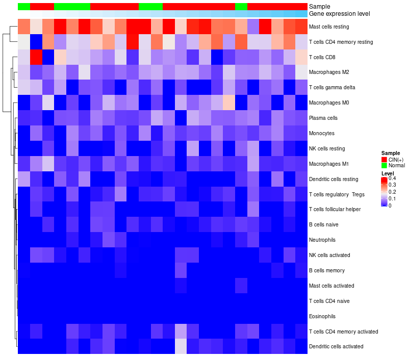 • Left: Heatmap of target gene expression and the level of various types of immune cells (cell type fractions) in all samples based on CIBERSORT method.