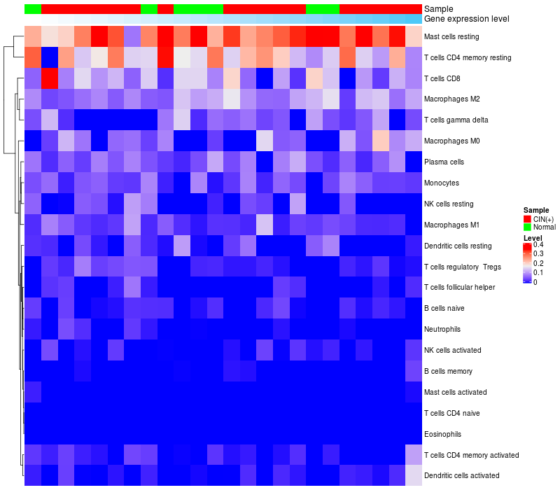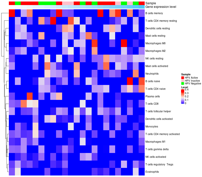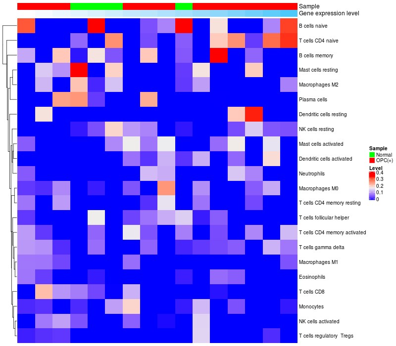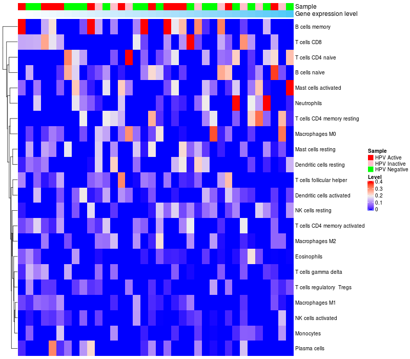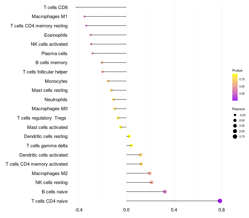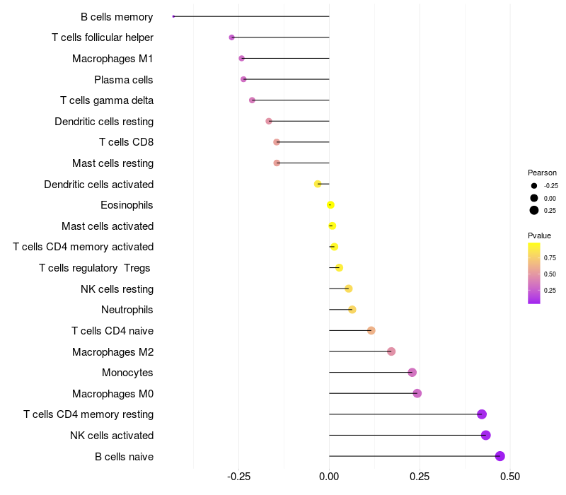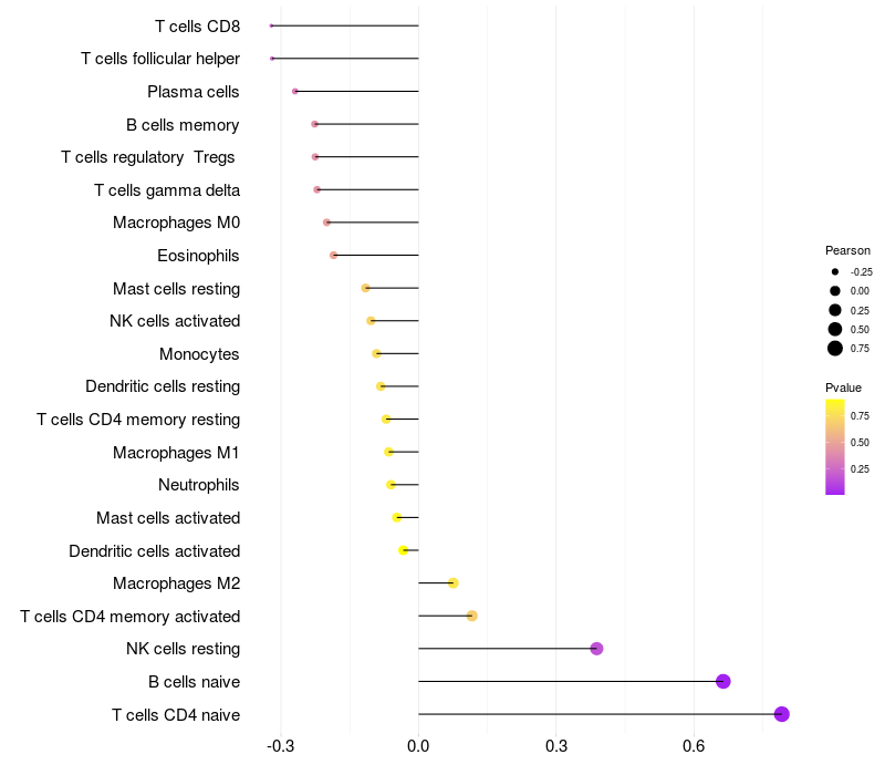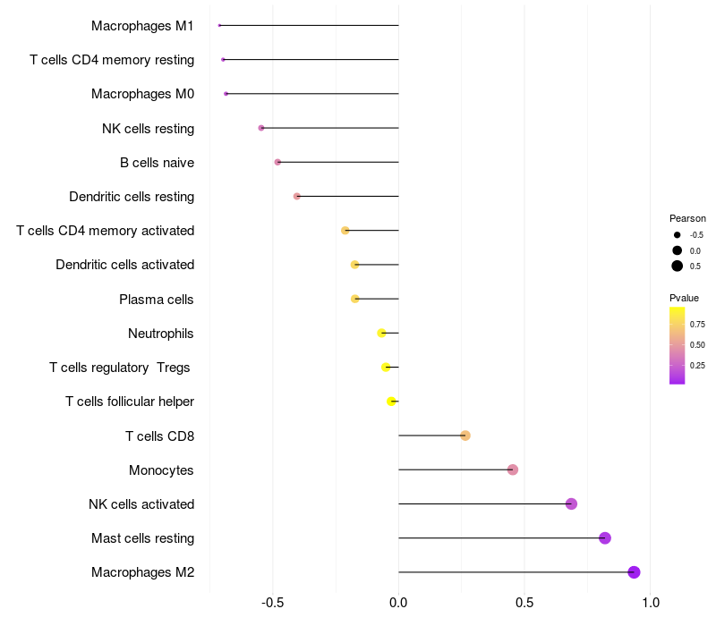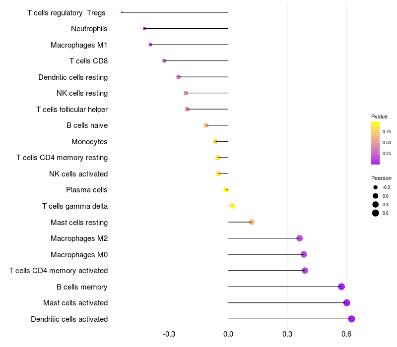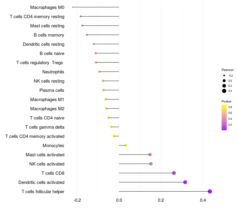 Lollipop of OR5M10 expression and immune infiltrating cell level correlation result in HPV+ samples