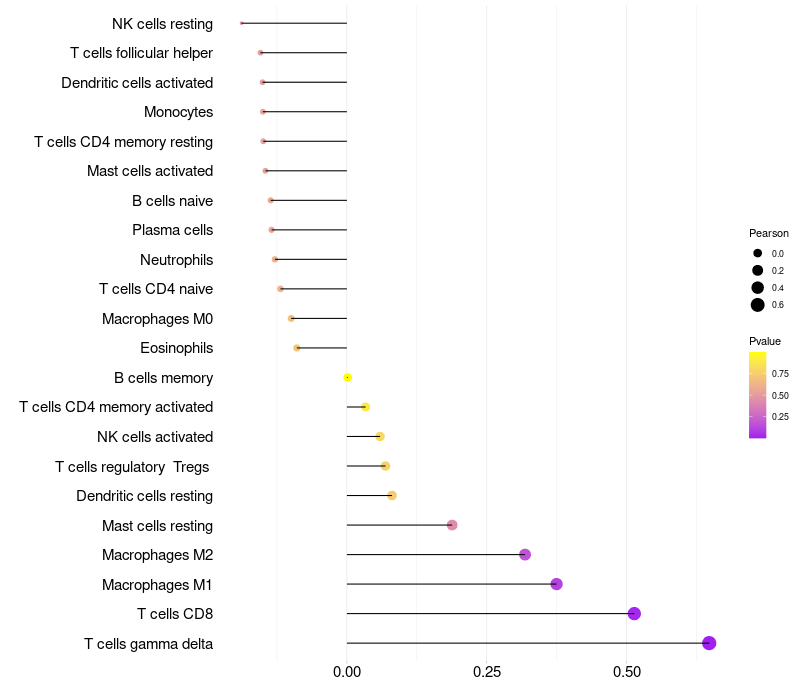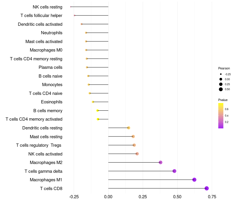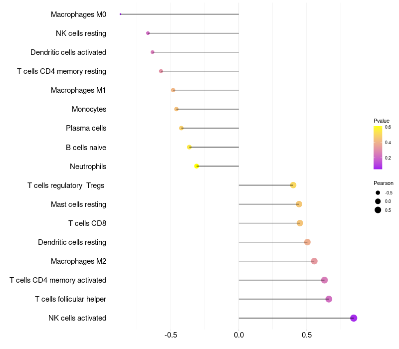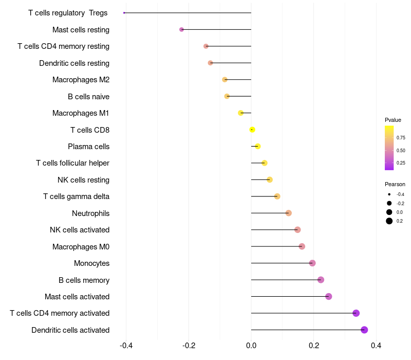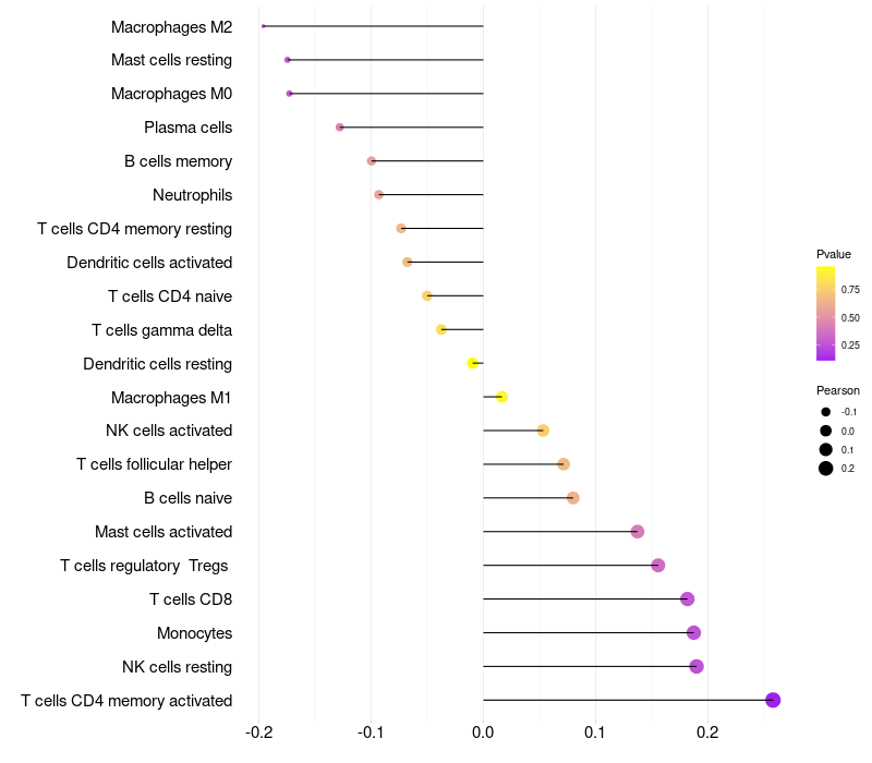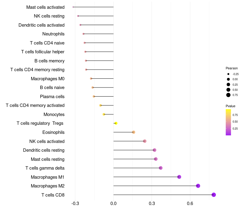 Lollipop of OR6C6 expression and immune infiltrating cell level correlation result in HPV+ samples