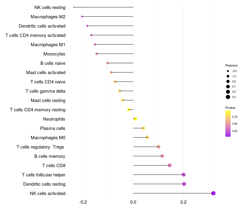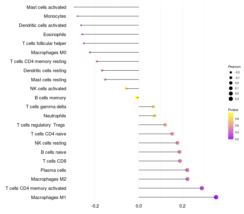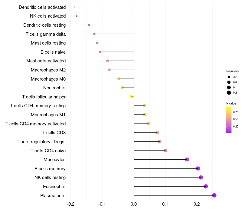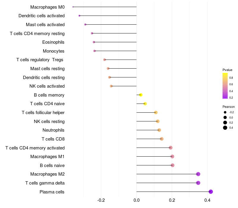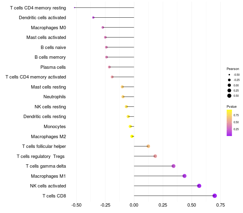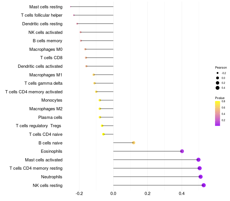Lollipop of OR8B12 expression and immune infiltrating cell level correlation result in HPV+ samples