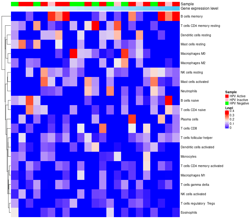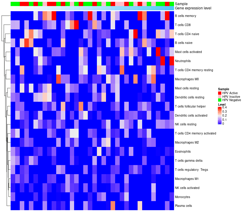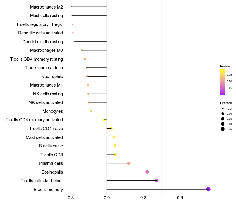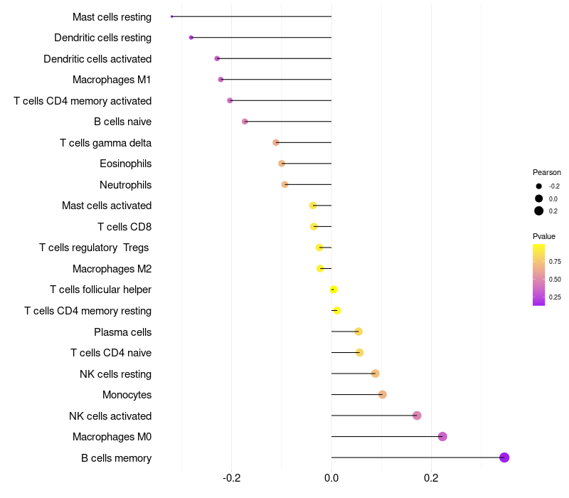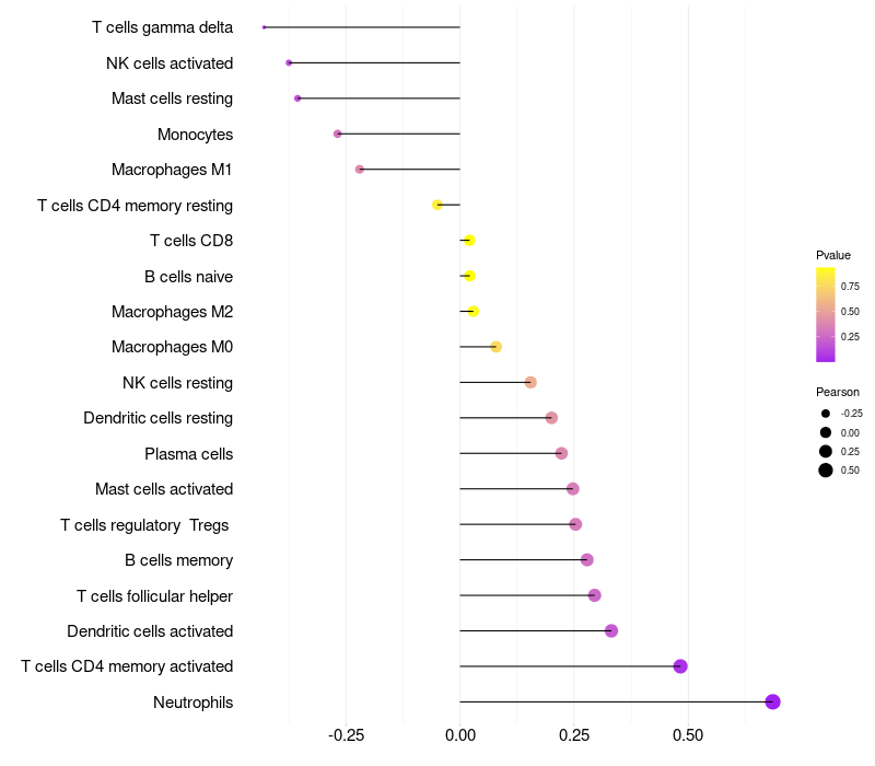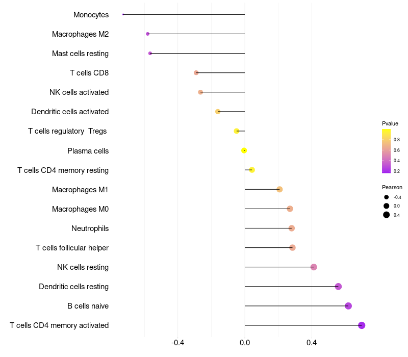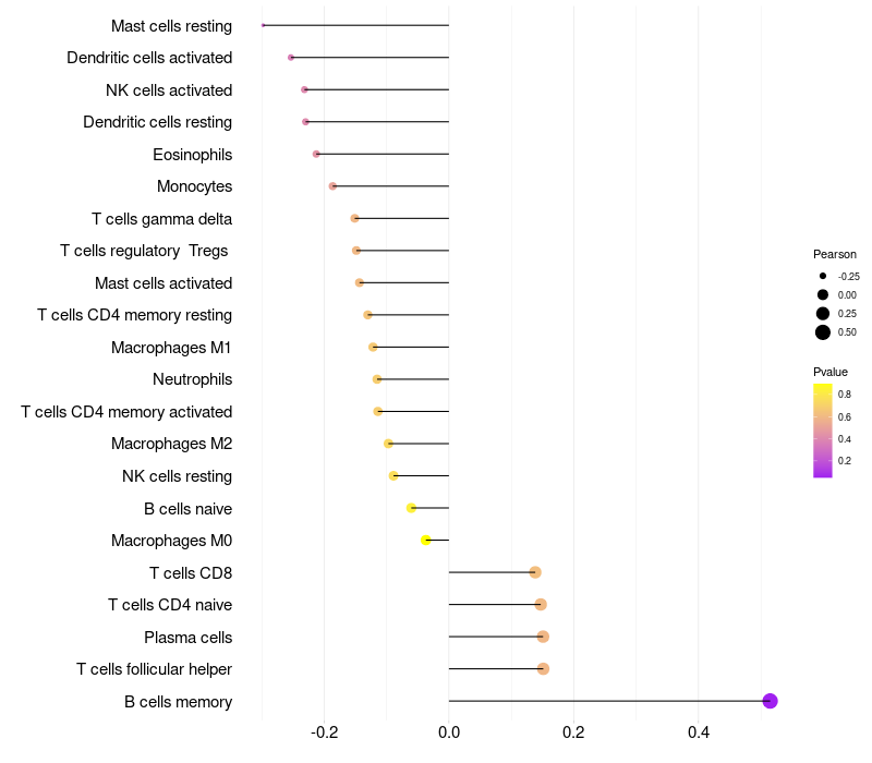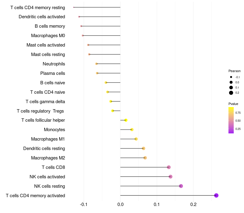 Lollipop of OR8K3 expression and immune infiltrating cell level correlation result in HPV+ samples