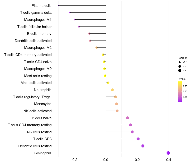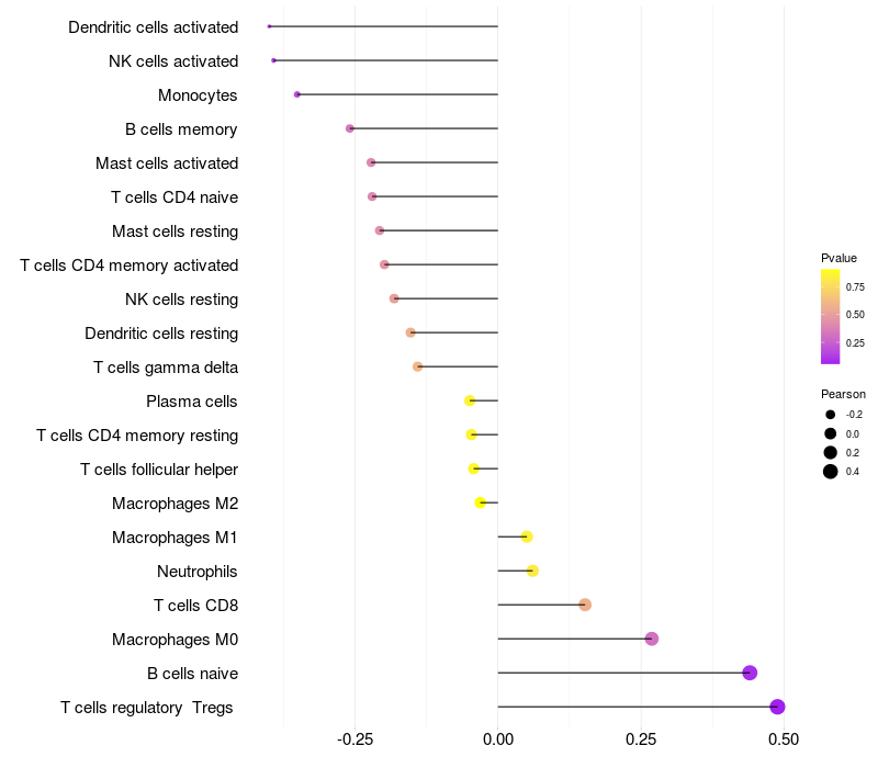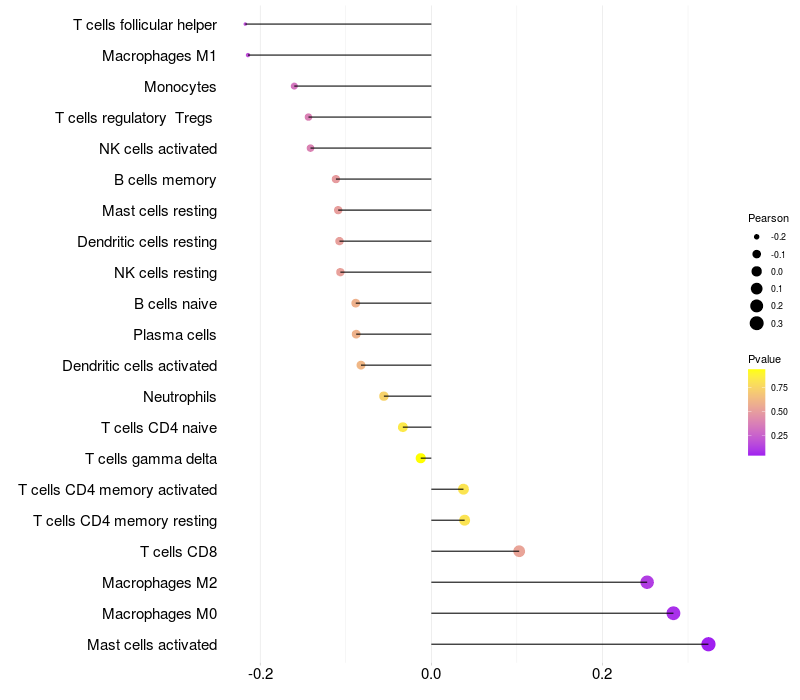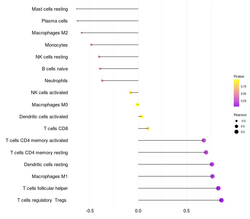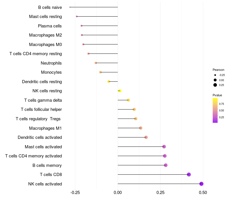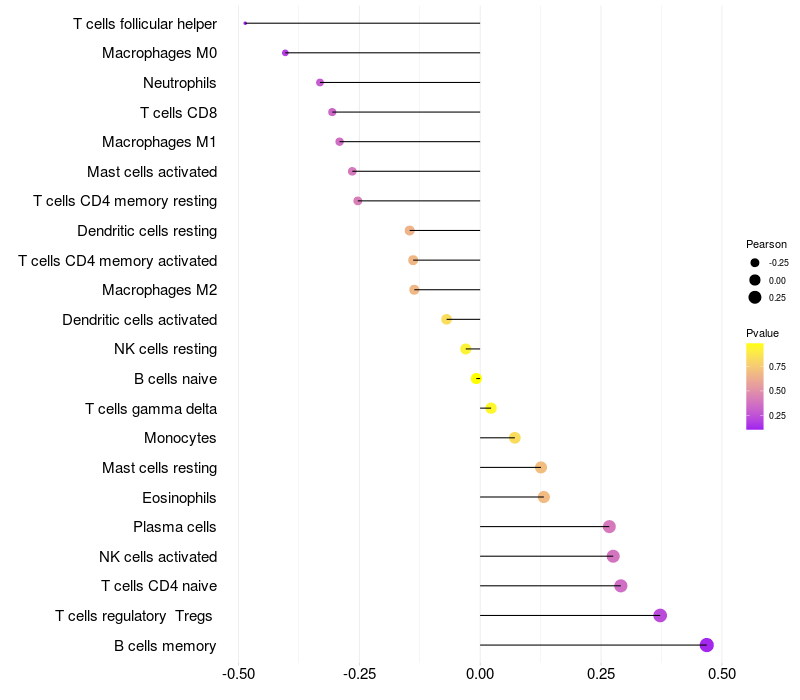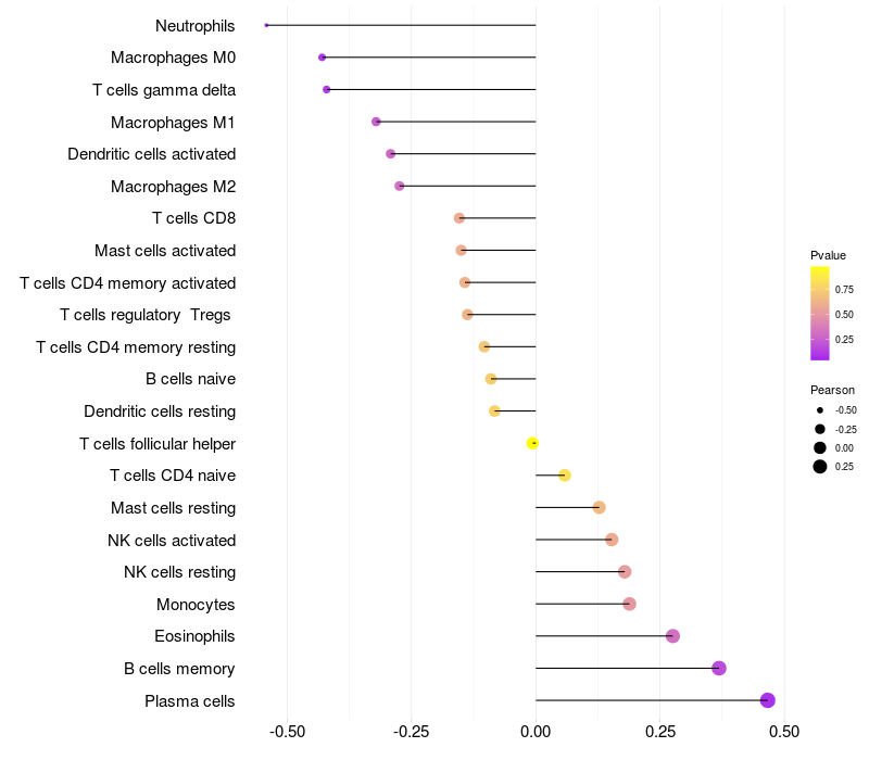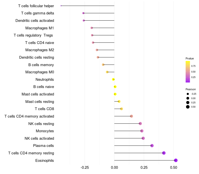 Lollipop of OTOS expression and immune infiltrating cell level correlation result in HPV+ samples