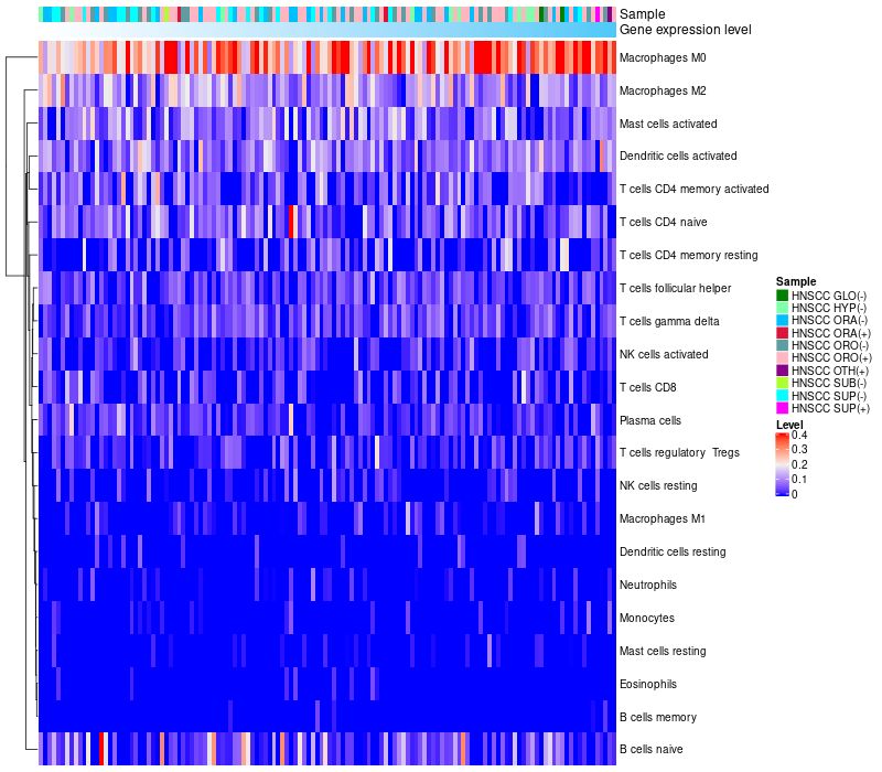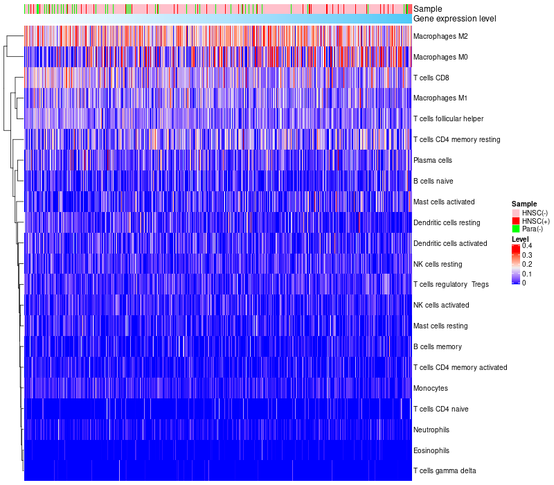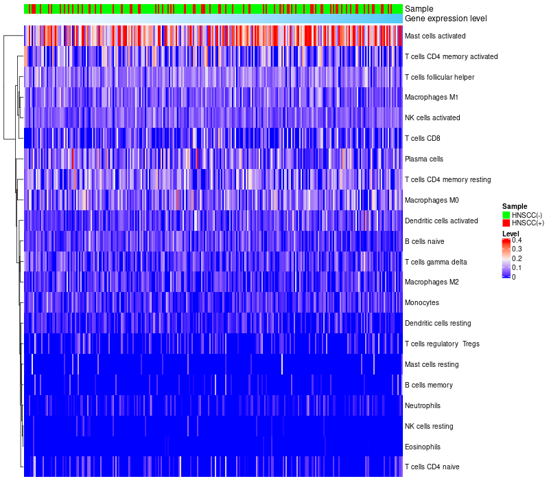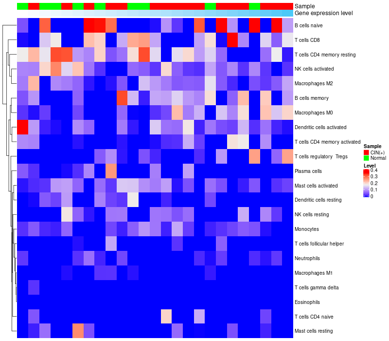 • Left: Heatmap of target gene expression and the level of various types of immune cells (cell type fractions) in all samples based on CIBERSORT method.