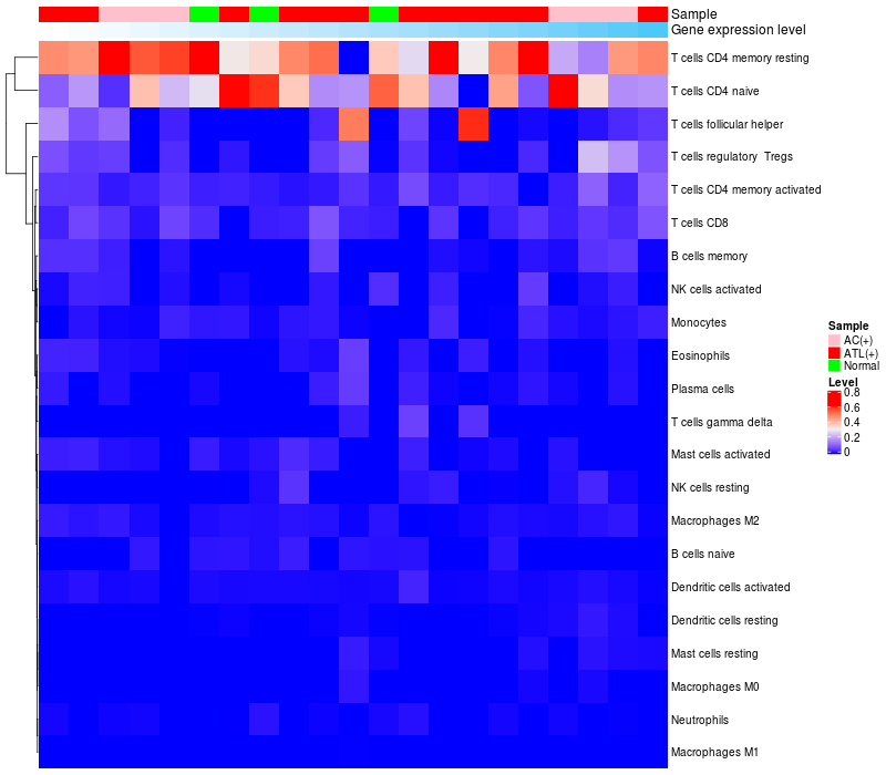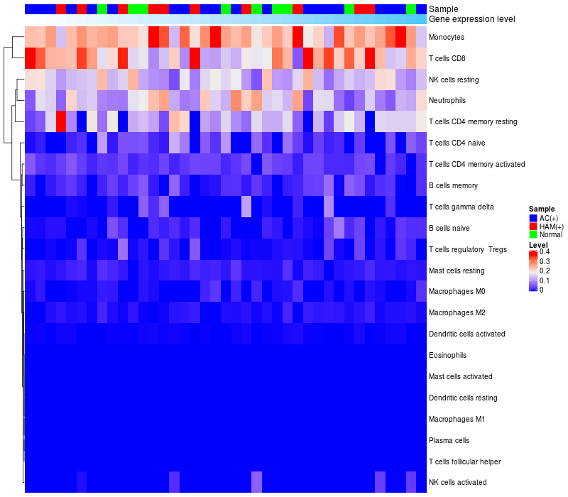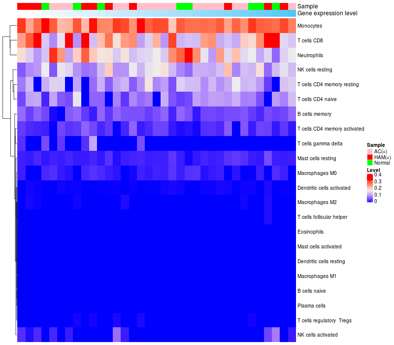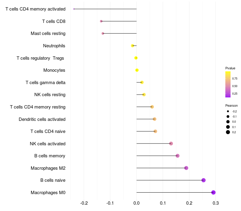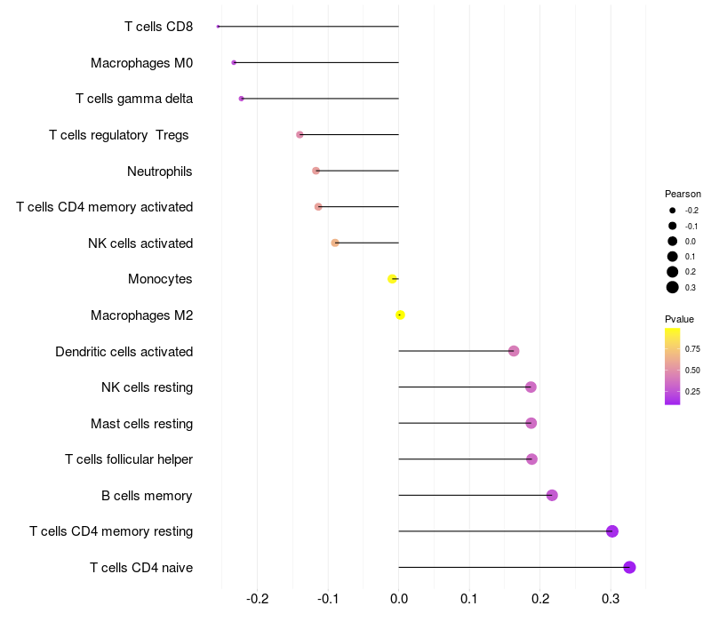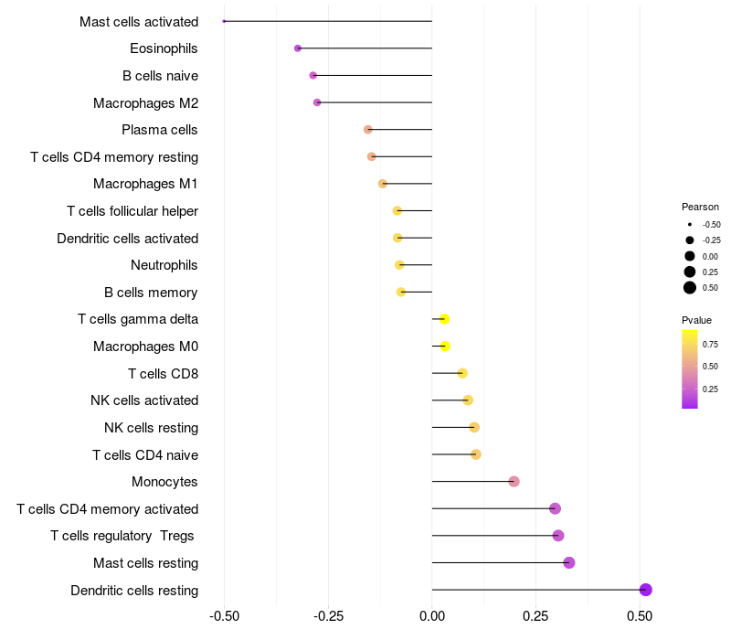 Lollipop of PADI1 expression and immune infiltrating cell level correlation result in HTLV1+ samples