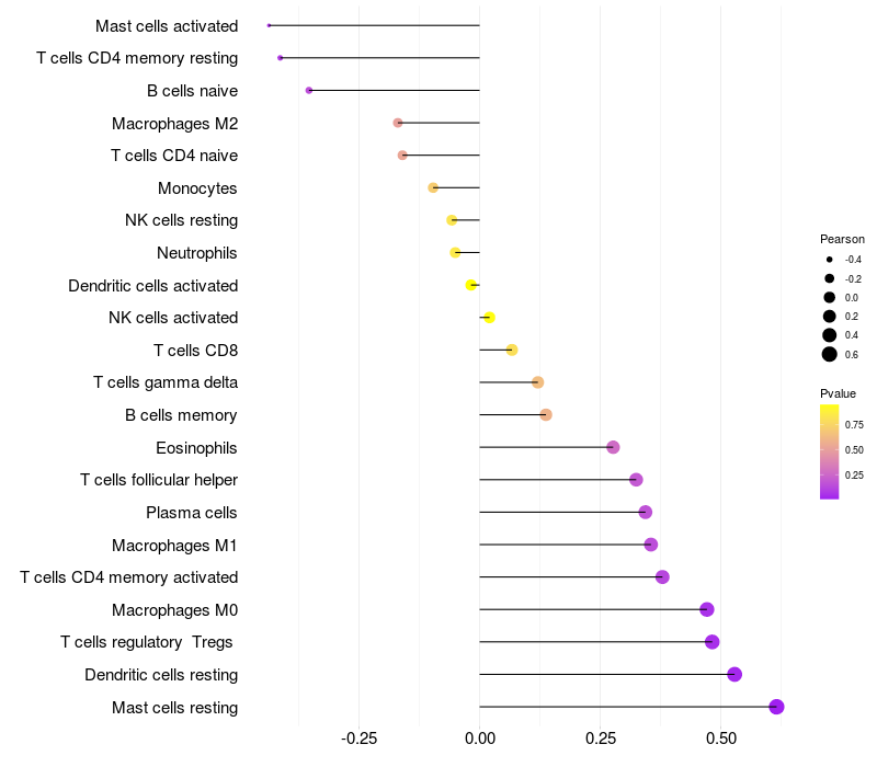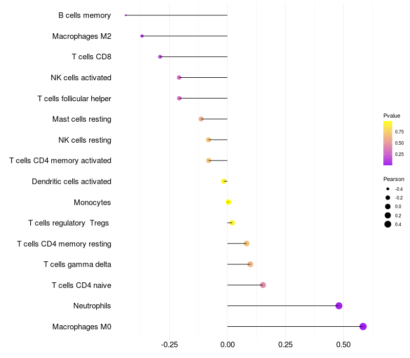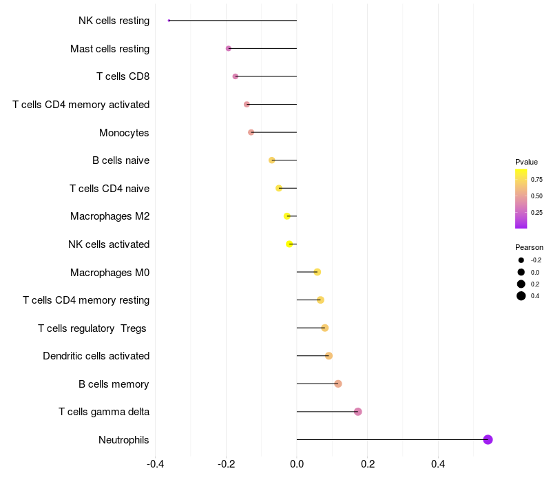 Lollipop of PADI2 expression and immune infiltrating cell level correlation result in HTLV1+ samples