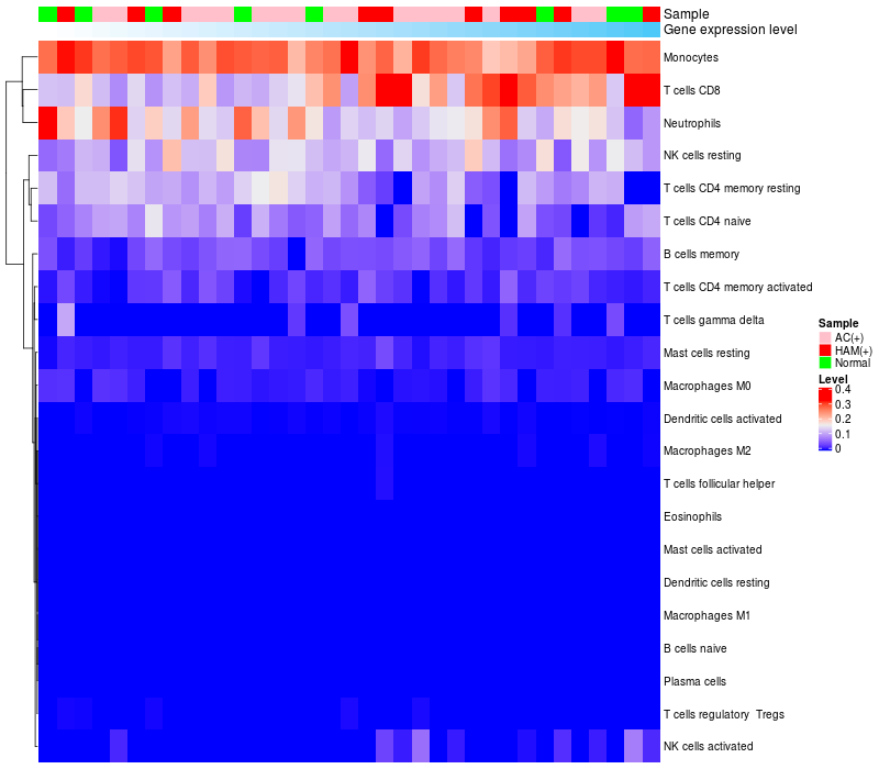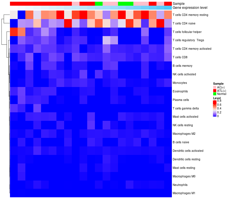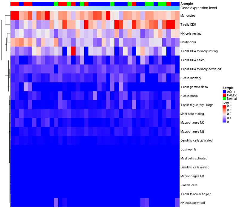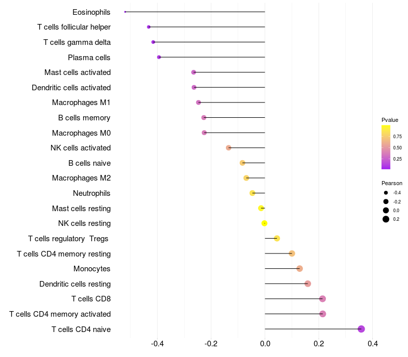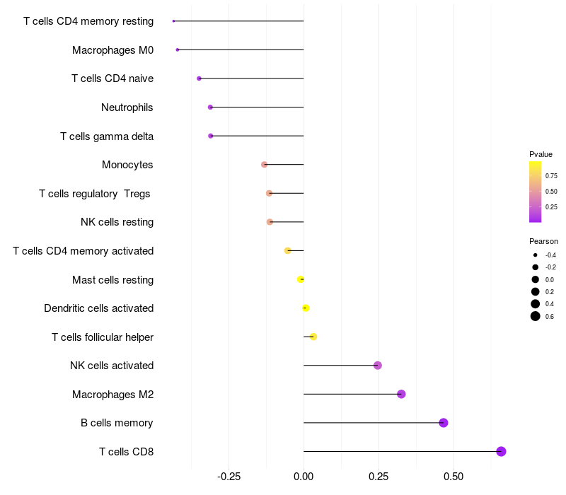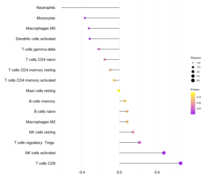 Lollipop of PAFAH2 expression and immune infiltrating cell level correlation result in HTLV1+ samples