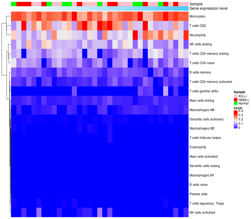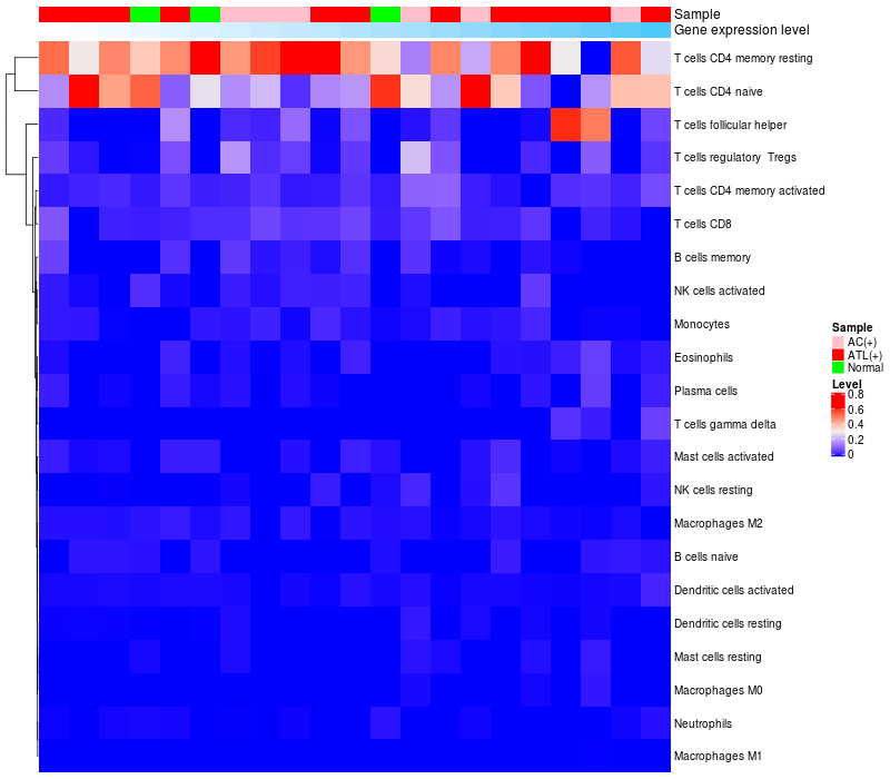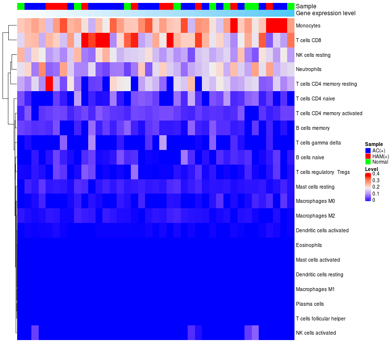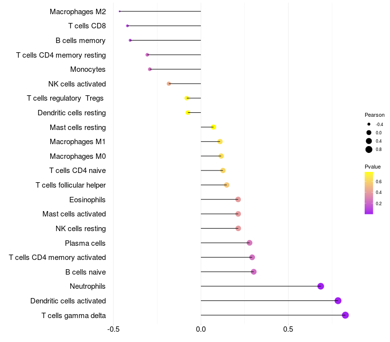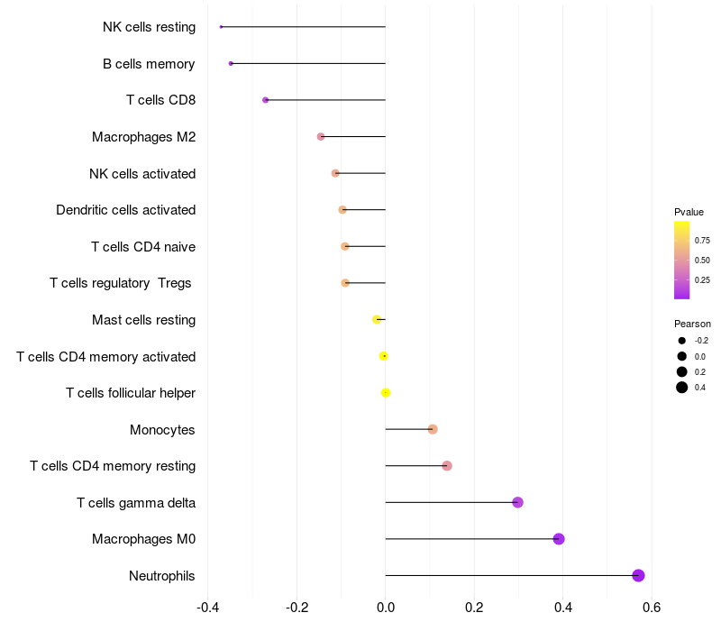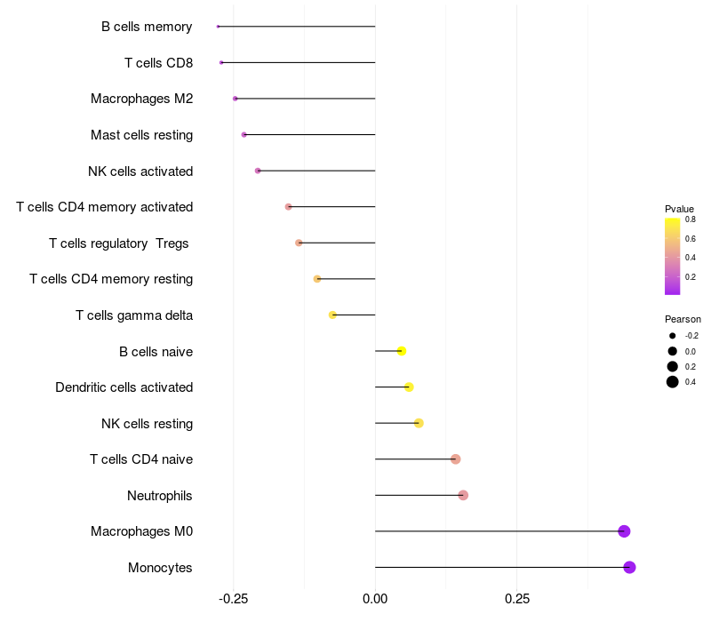 Lollipop of PAIP2 expression and immune infiltrating cell level correlation result in HTLV1+ samples