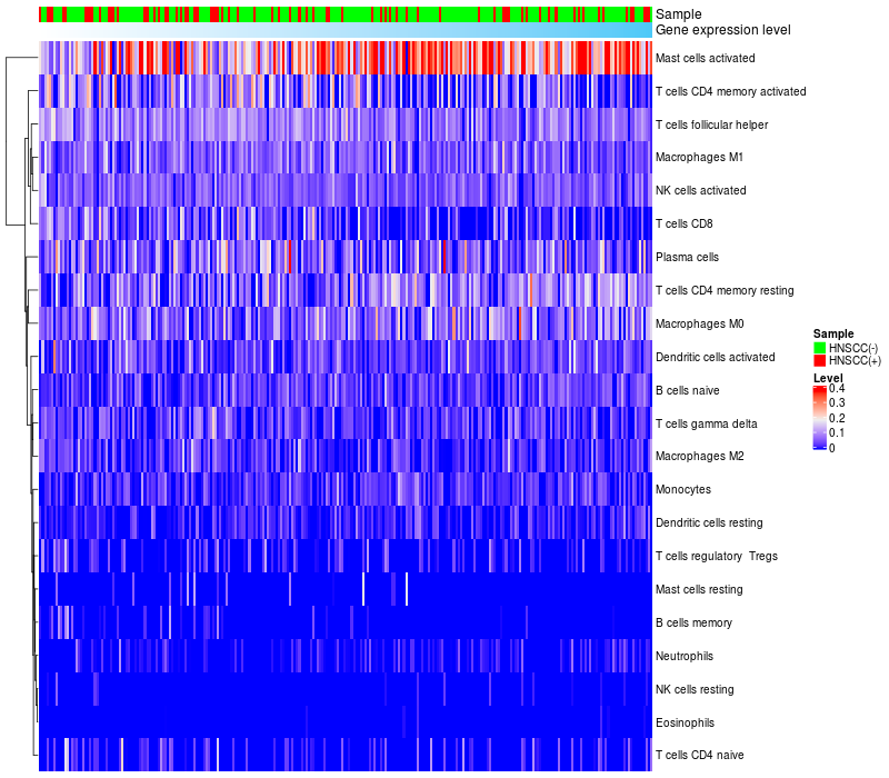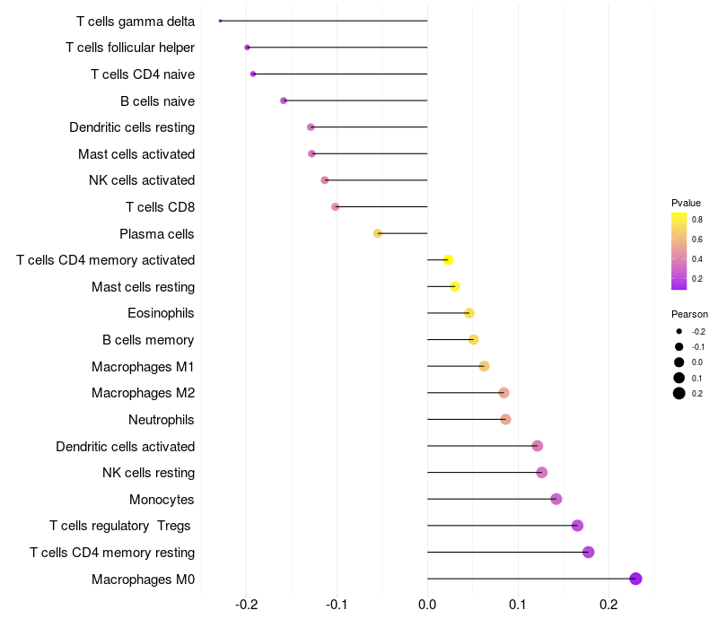 Lollipop of PALLD expression and immune infiltrating cell level correlation result in HPV+ samples