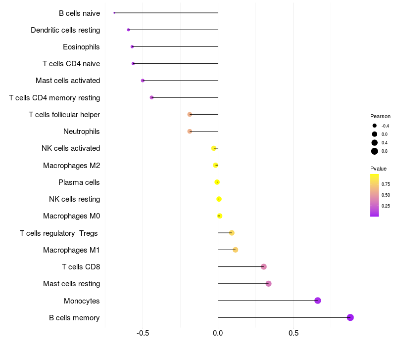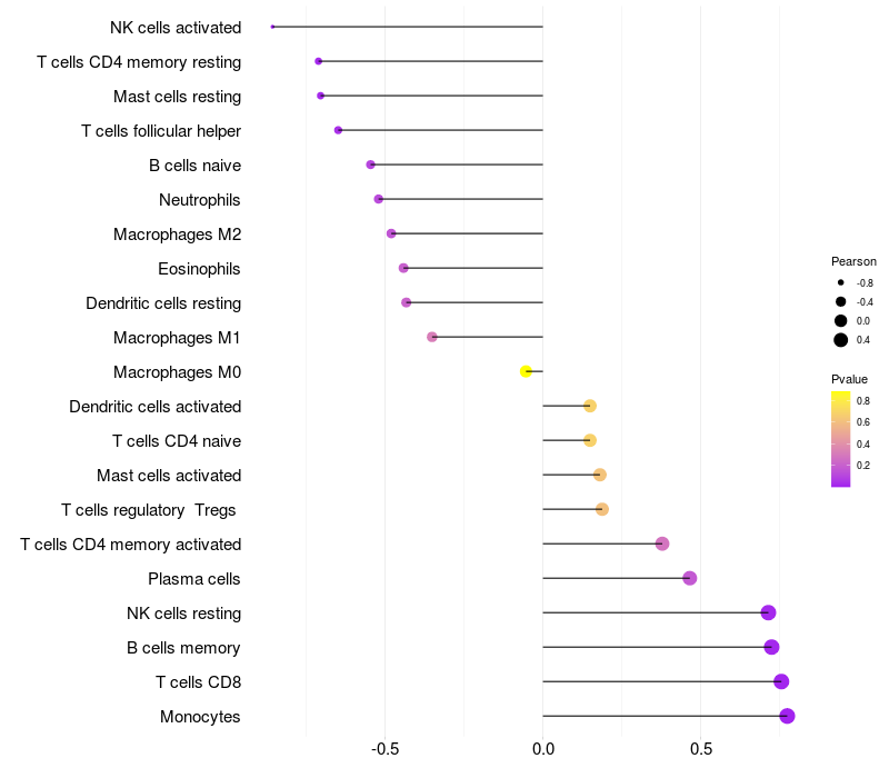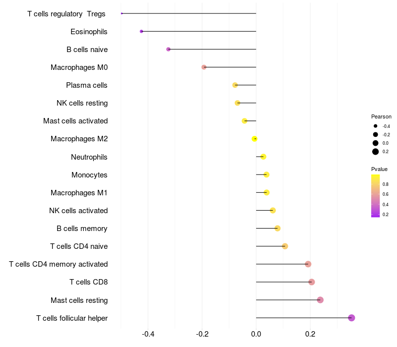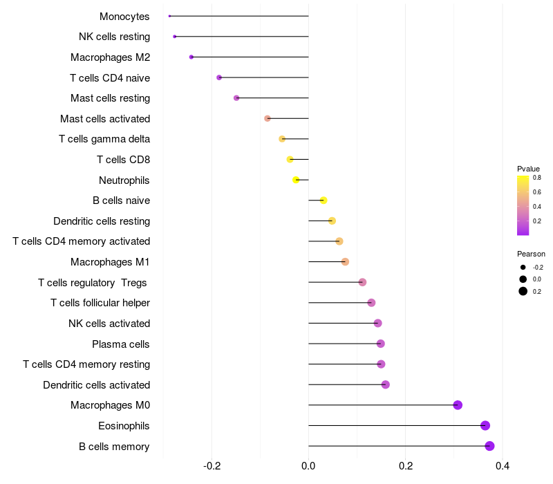 Lollipop of PAN3 expression and immune infiltrating cell level correlation result in HBV+ Liver cirrhosis samples