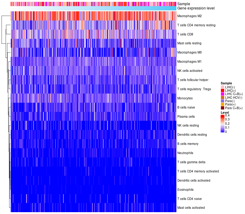Liver hepatocellular carcinoma HCV (HBV+)(86), Liver hepatocellular carcinoma HCV (HBV-)(19), Liver hepatocellular carcinoma (HBV+)(209), Liver hepatocellular carcinoma (HBV+)(60), Paracancerous HCV (HBV+)(4), Paracancerous (HBV-)(28), Paracancerous (HBV+)(18) |