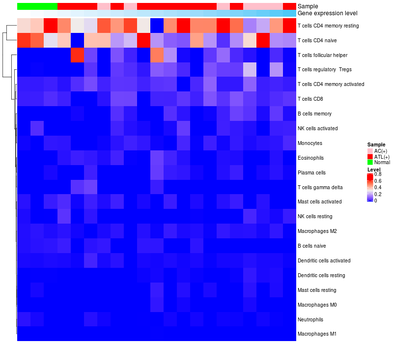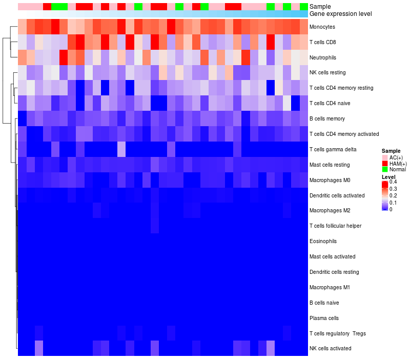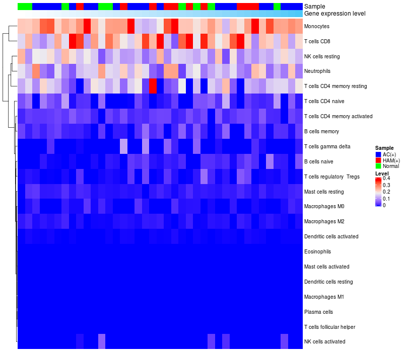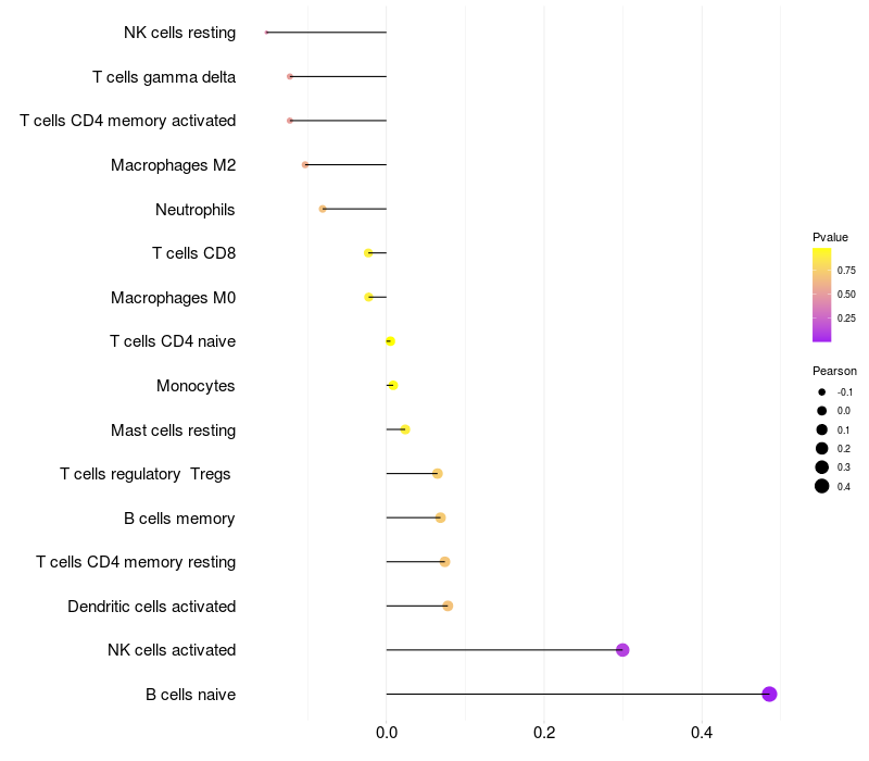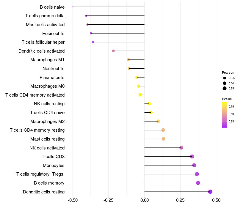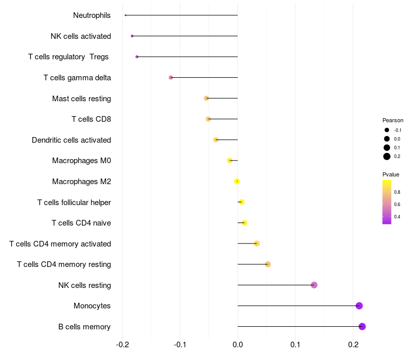 Lollipop of PANX3 expression and immune infiltrating cell level correlation result in HTLV1+ samples