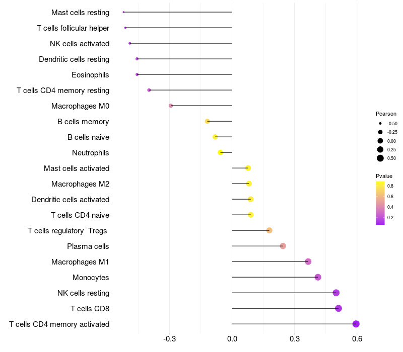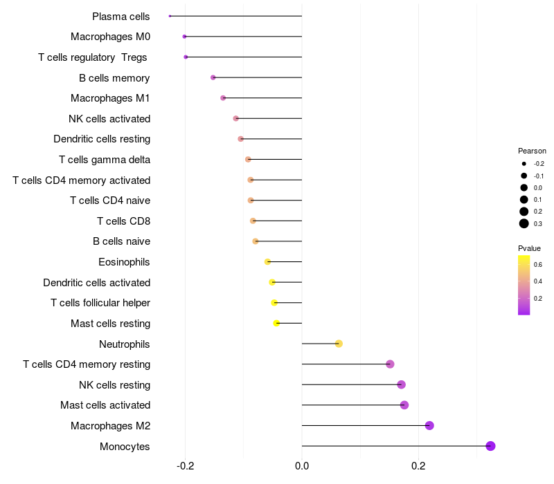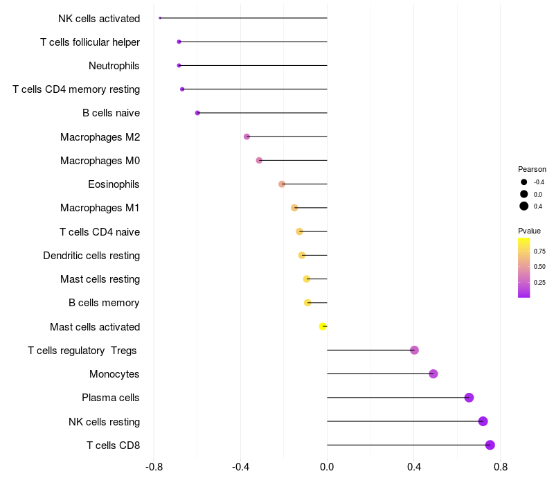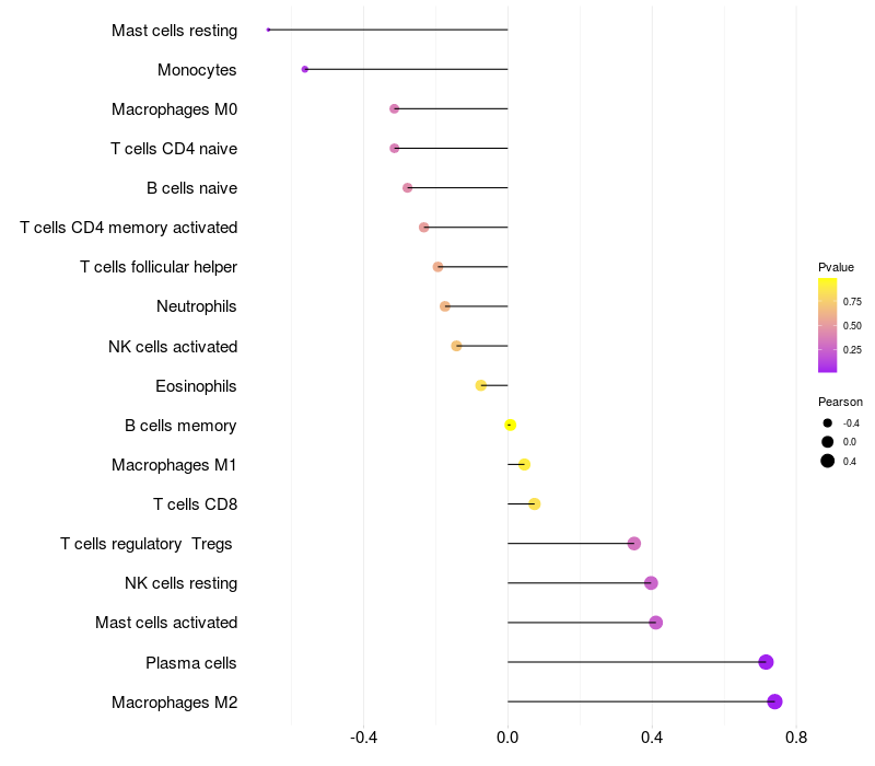 Lollipop of PAPPA2 expression and immune infiltrating cell level correlation result in HBV+ Liver cirrhosis samples