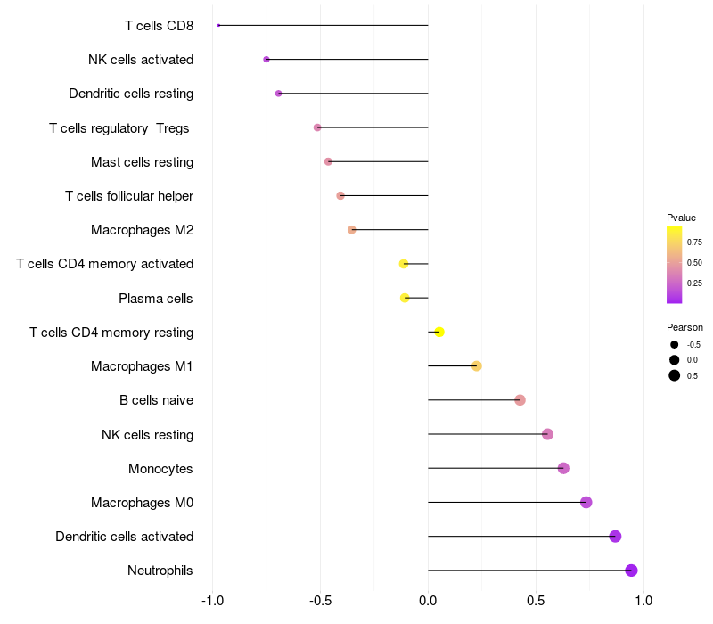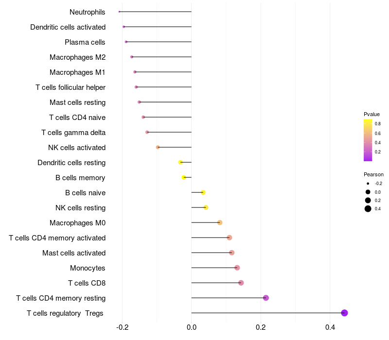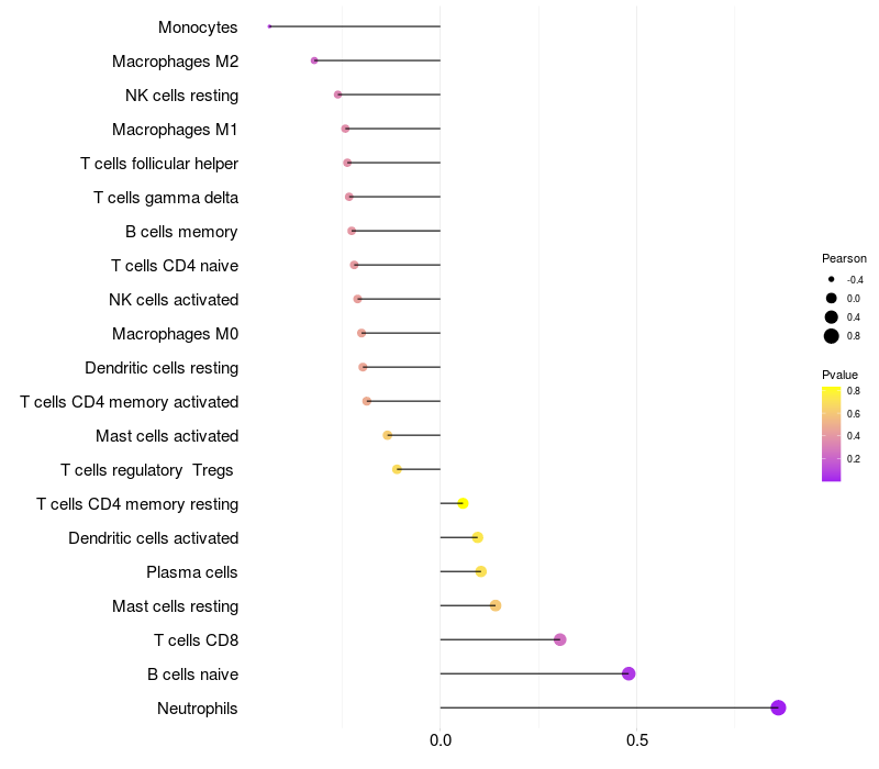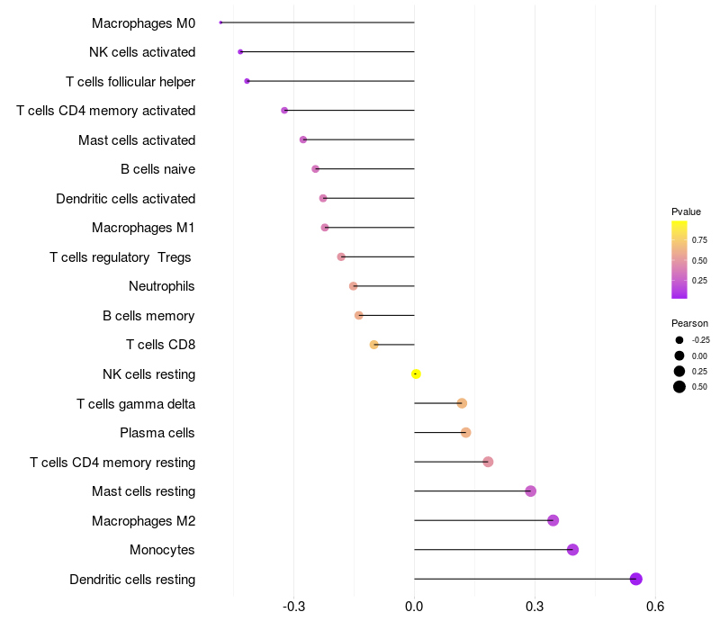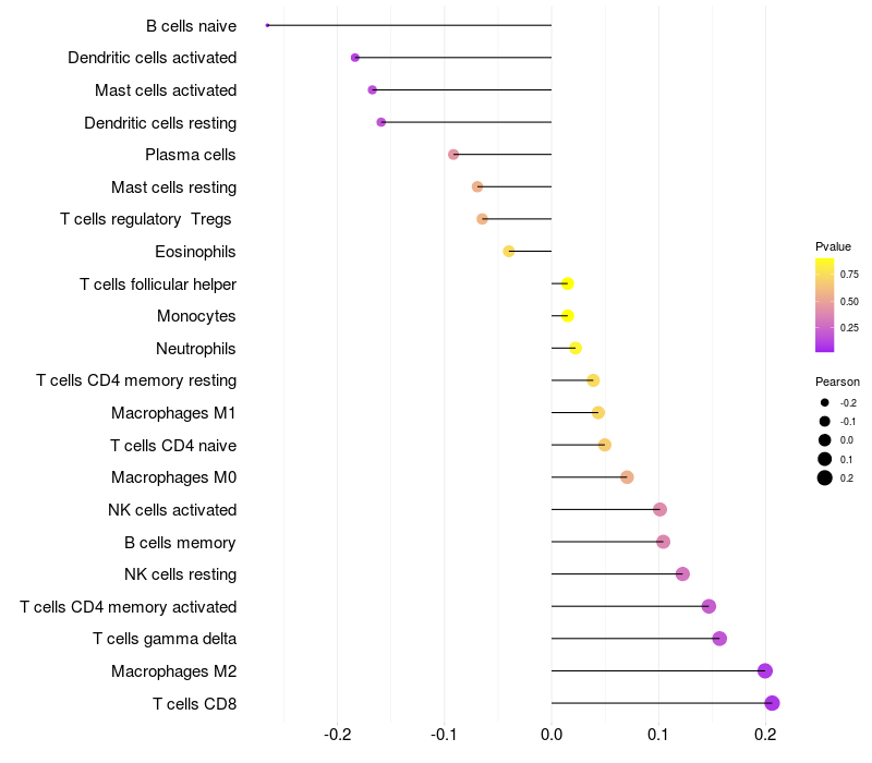 Lollipop of PAPSS2 expression and immune infiltrating cell level correlation result in HPV+ samples
