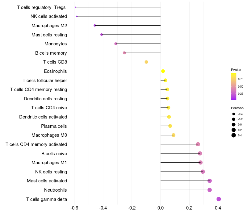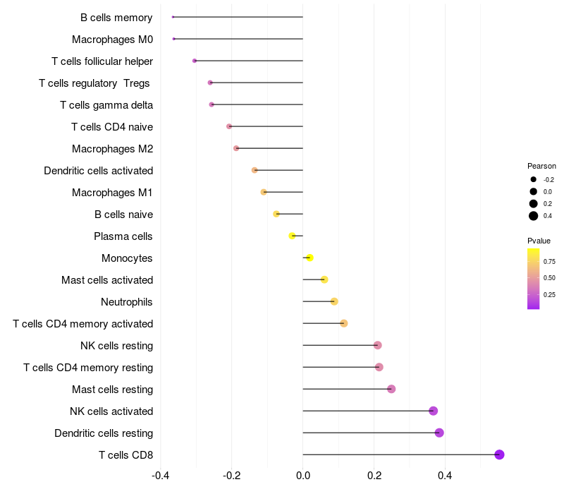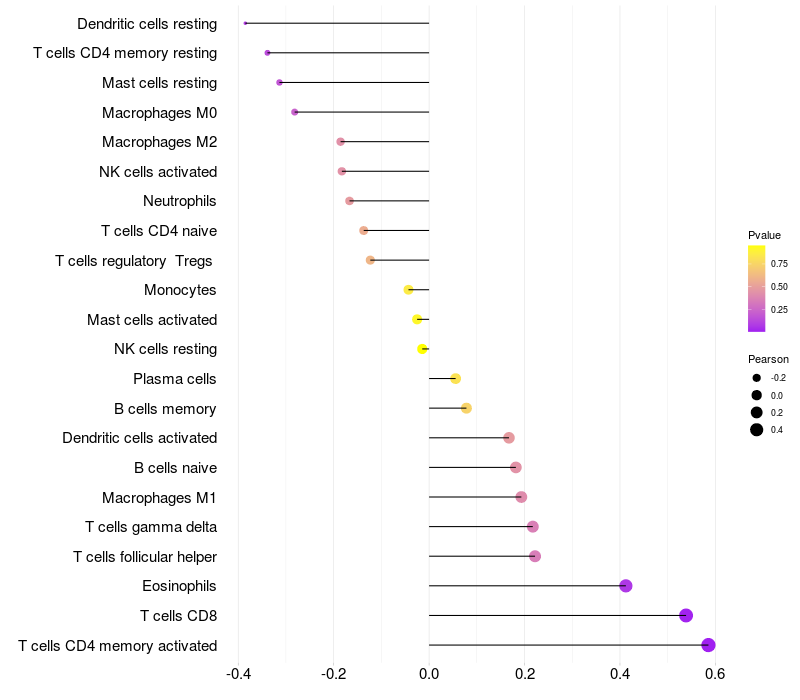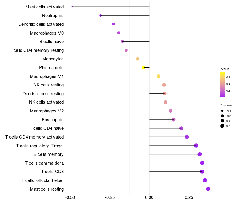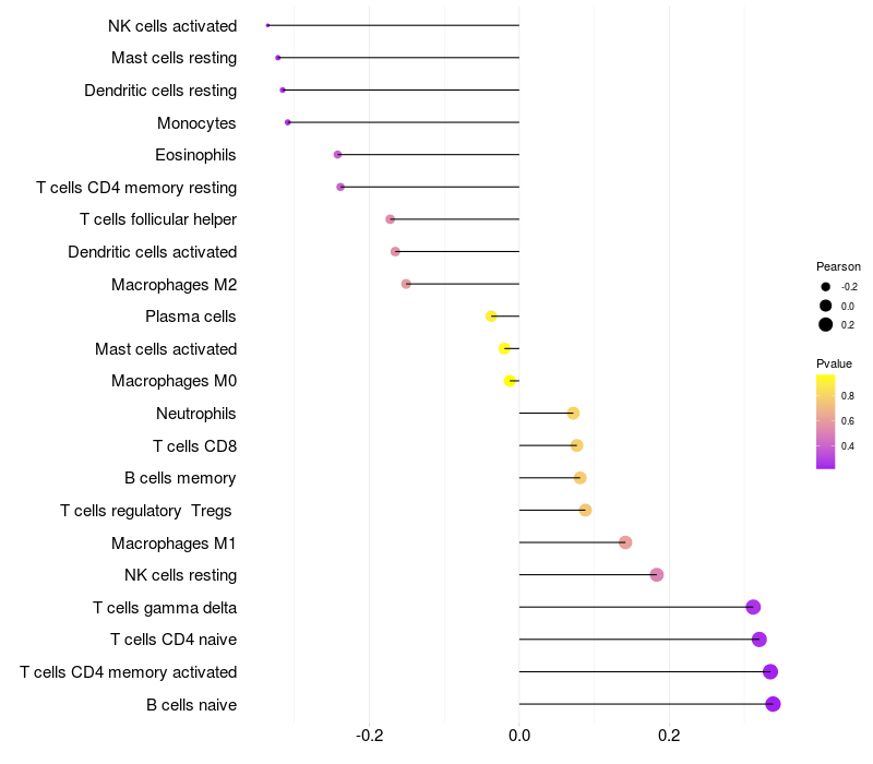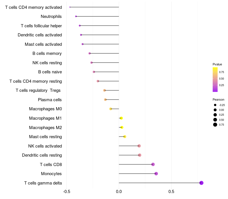 Lollipop of PAQR8 expression and immune infiltrating cell level correlation result in HPV+ samples