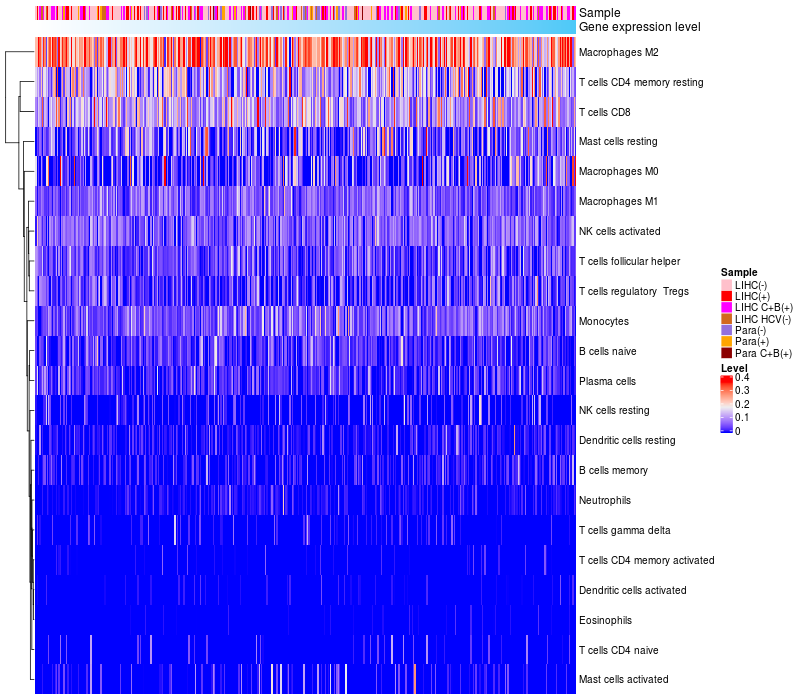 Liver hepatocellular carcinoma HCV (HBV+)(86), Liver hepatocellular carcinoma HCV (HBV-)(19), Liver hepatocellular carcinoma (HBV+)(209), Liver hepatocellular carcinoma (HBV+)(60), Paracancerous HCV (HBV+)(4), Paracancerous (HBV-)(28), Paracancerous (HBV+)(18) |