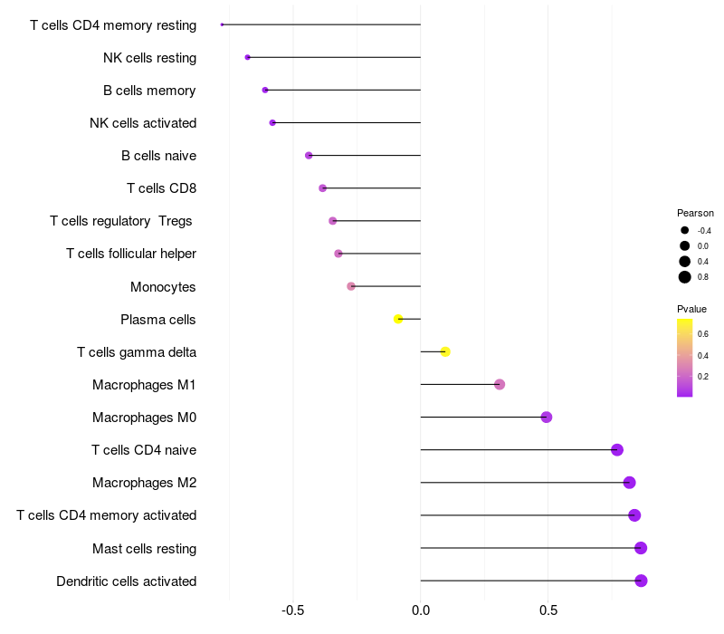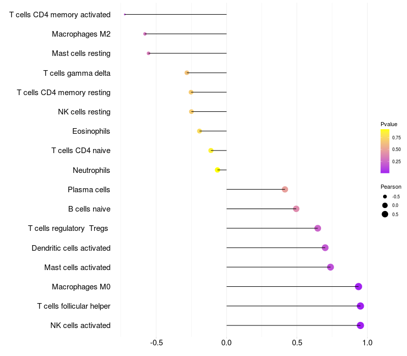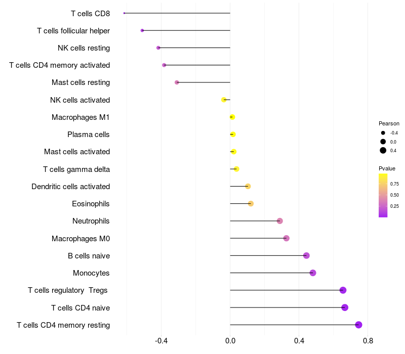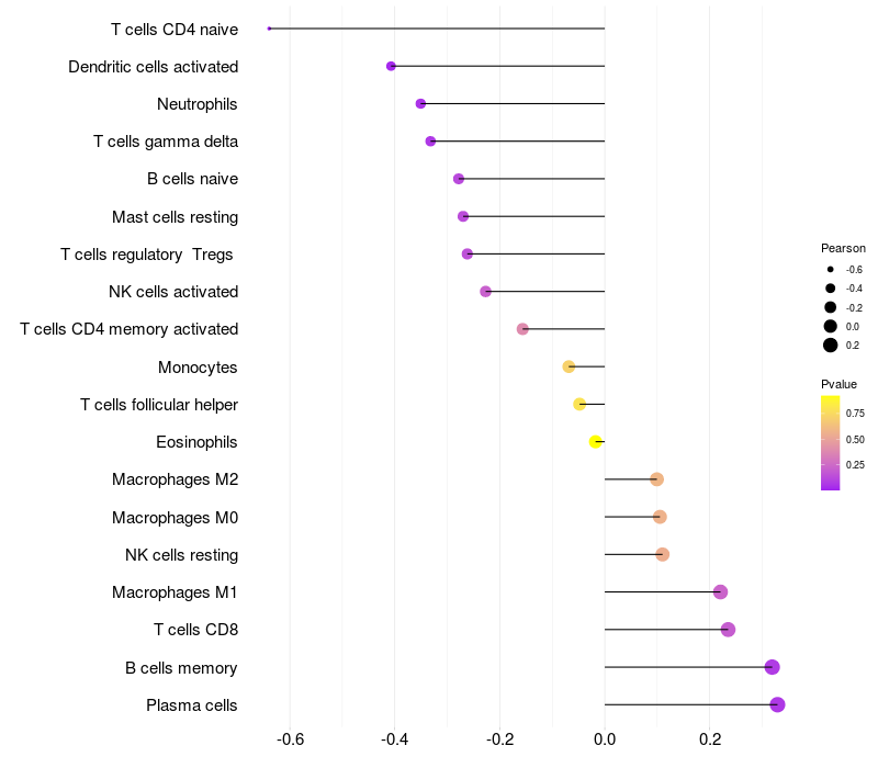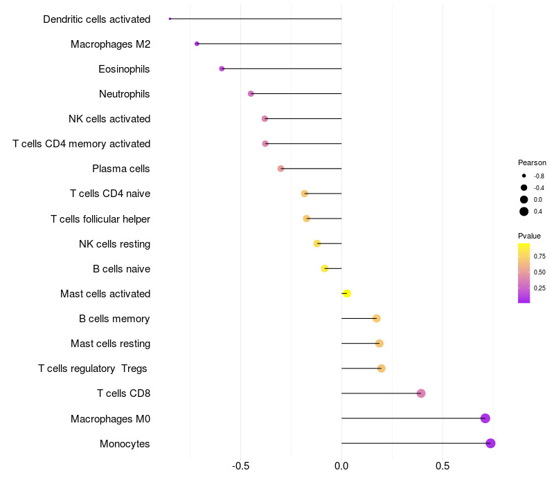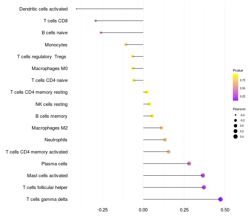 Lollipop of PARVA expression and immune infiltrating cell level correlation result in EBV+ samples
