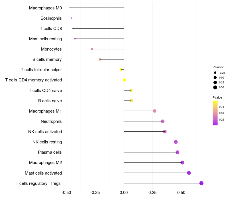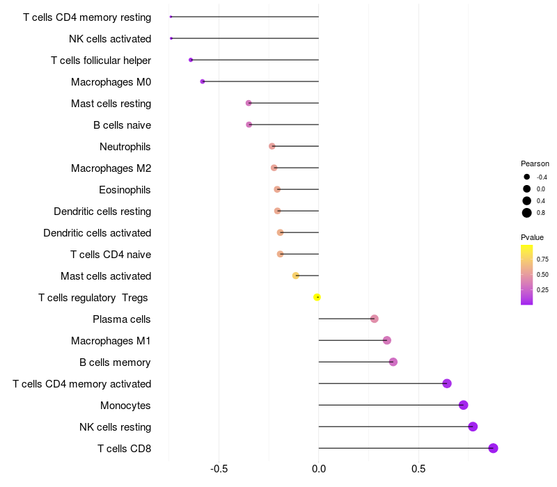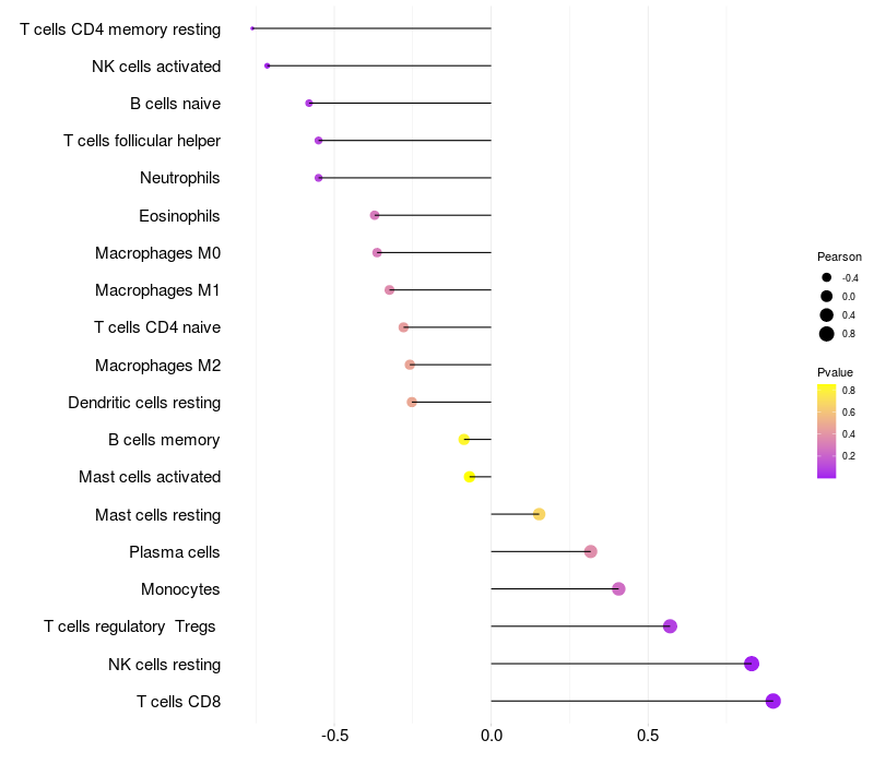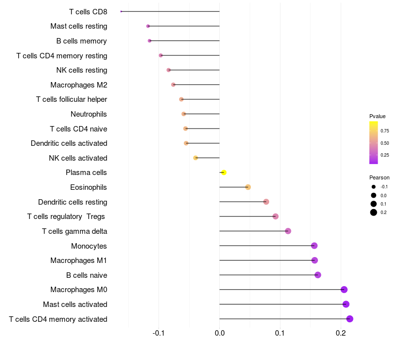 Lollipop of PASD1 expression and immune infiltrating cell level correlation result in HBV+ Liver cirrhosis samples