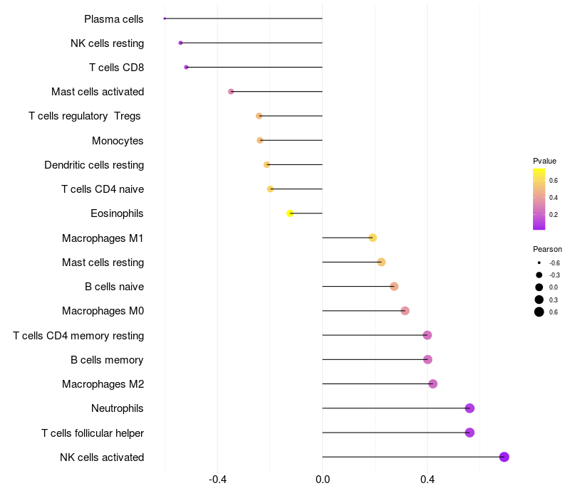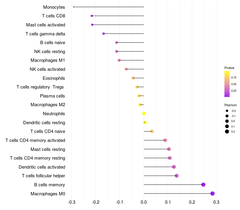 Lollipop of PAXIP1 expression and immune infiltrating cell level correlation result in HBV+ Liver cirrhosis samples
