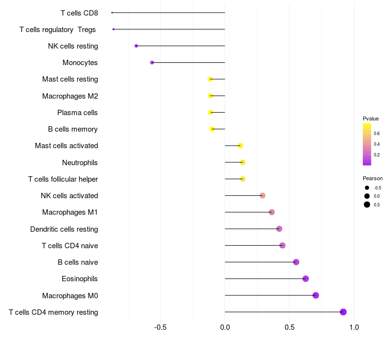Lollipop of PBX3 expression and immune infiltrating cell level correlation result in HBV+ samples