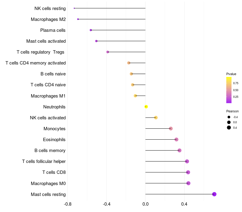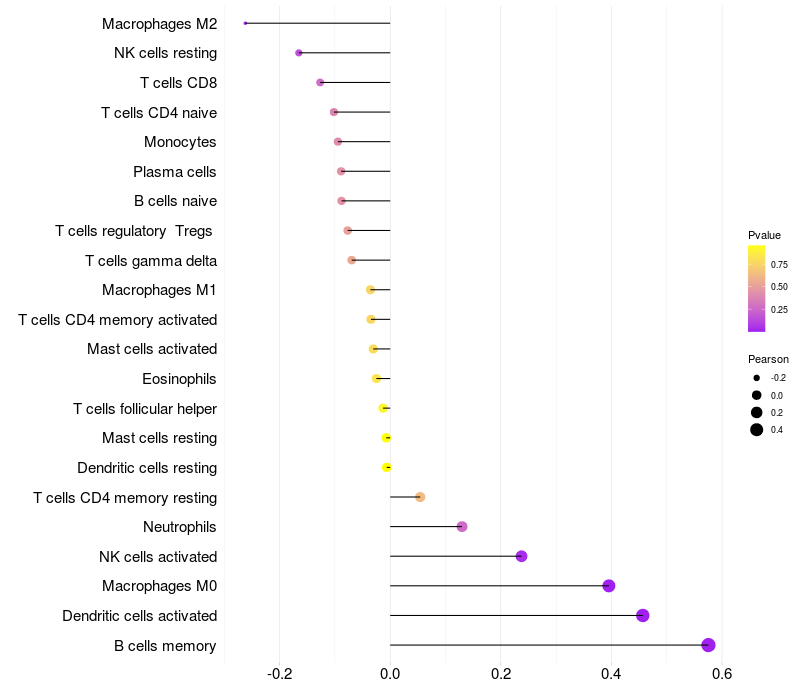 Lollipop of PBX3 expression and immune infiltrating cell level correlation result in HBV+ Chronic HBV (CHB) infection samples