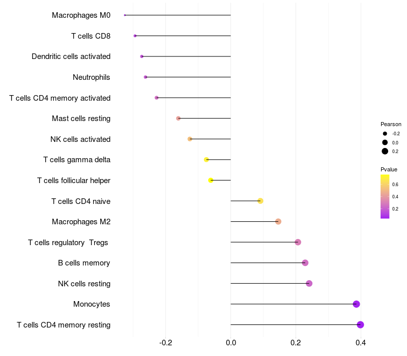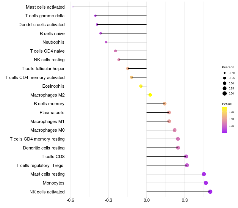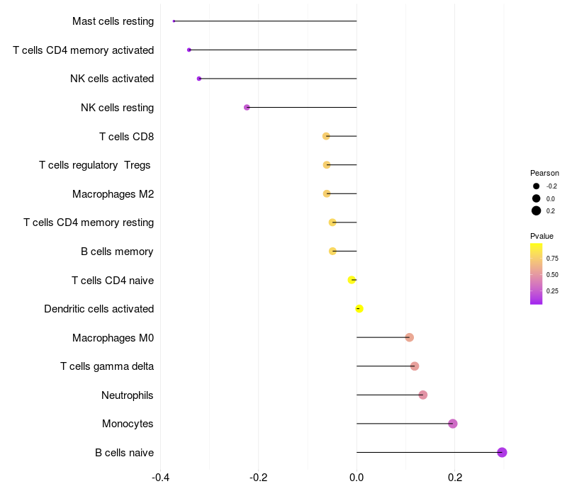 Lollipop of PC expression and immune infiltrating cell level correlation result in HTLV1+ samples