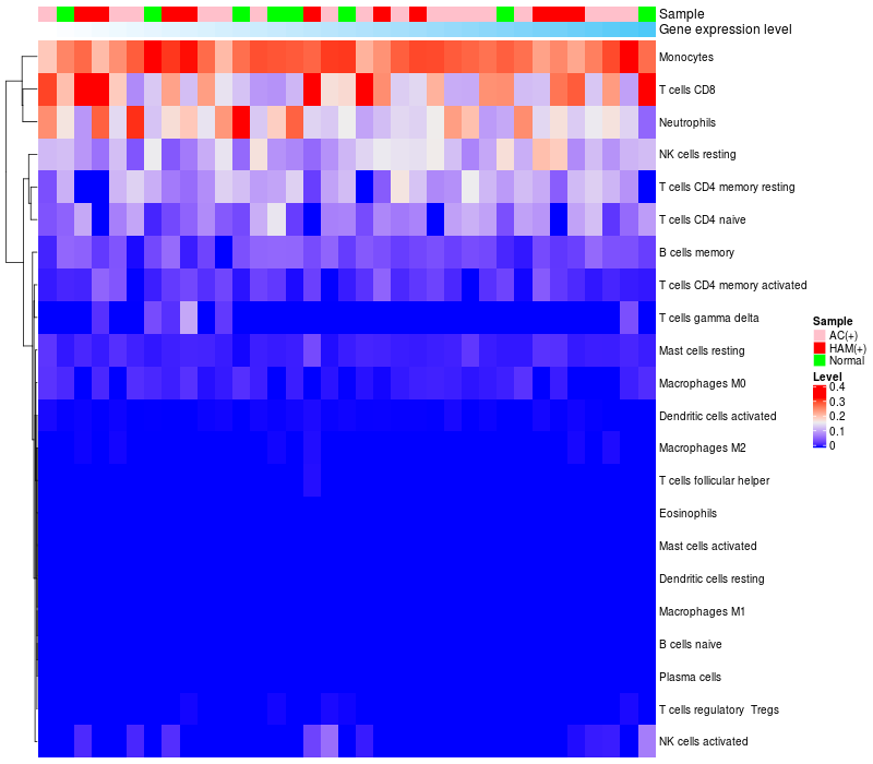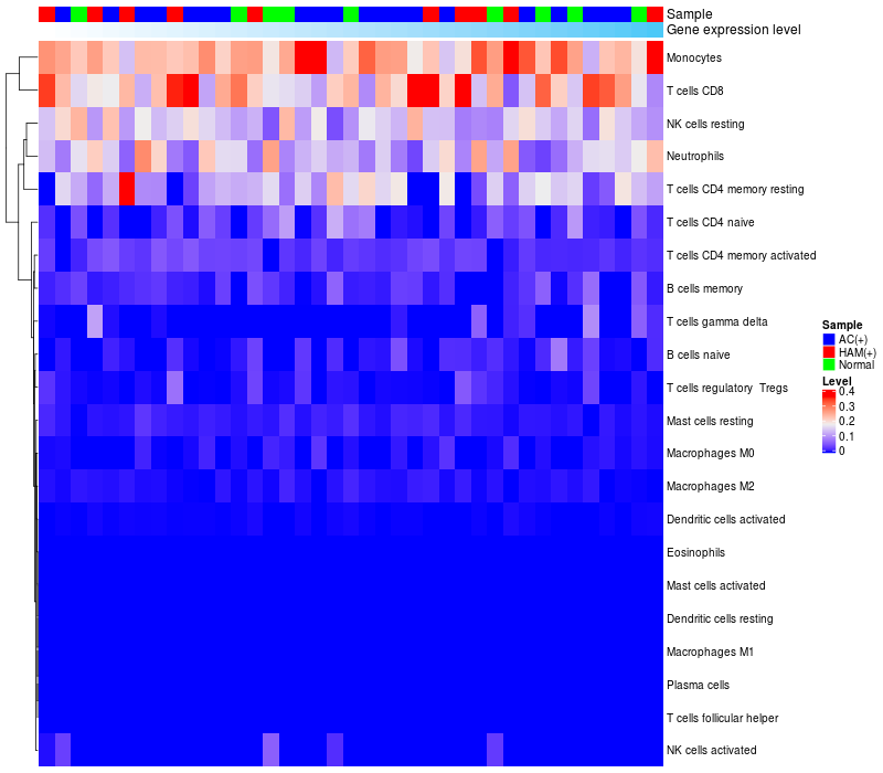 Normal (8), Asymptomatic carriers (HTLV1+)(17), HTLV-1-associated myelopathy (HTLV1+)(10) |