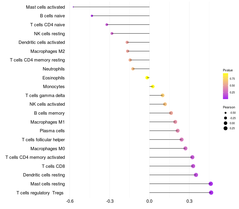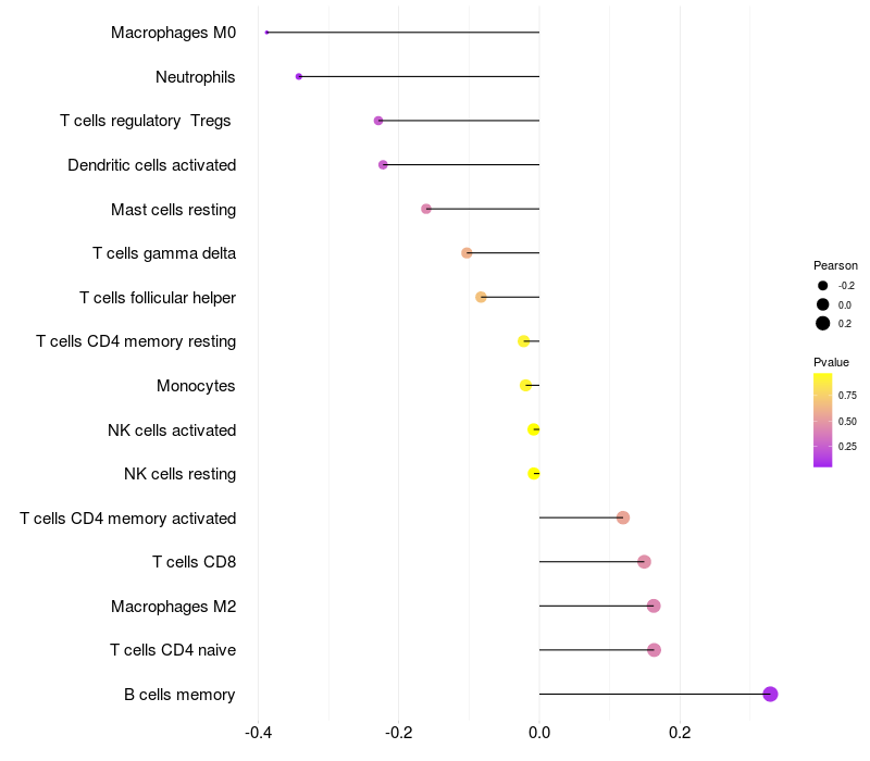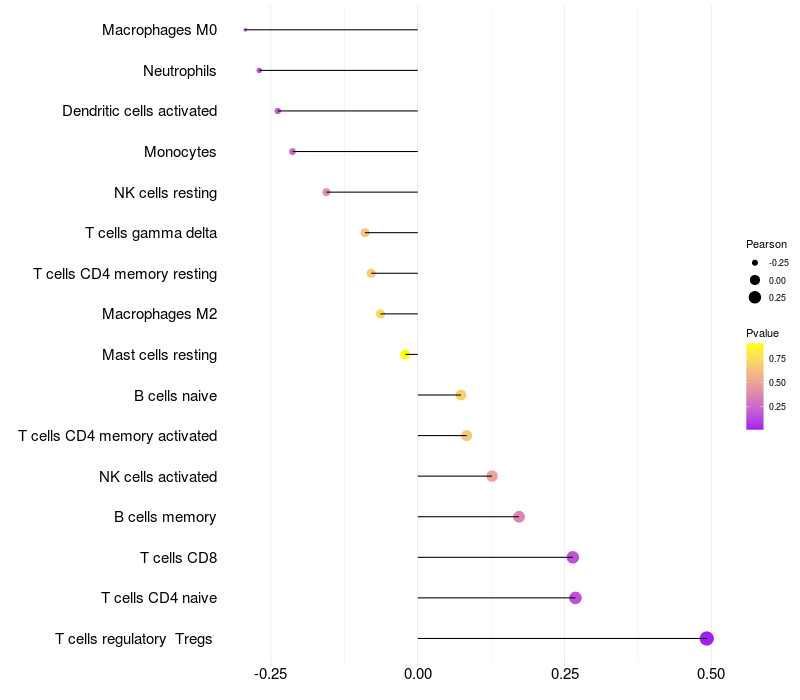 Lollipop of PCBD2 expression and immune infiltrating cell level correlation result in HTLV1+ samples