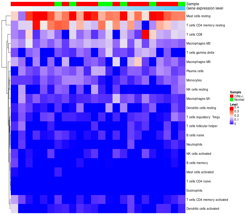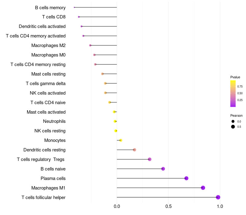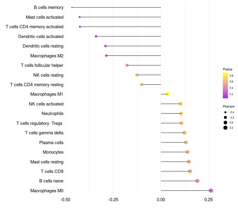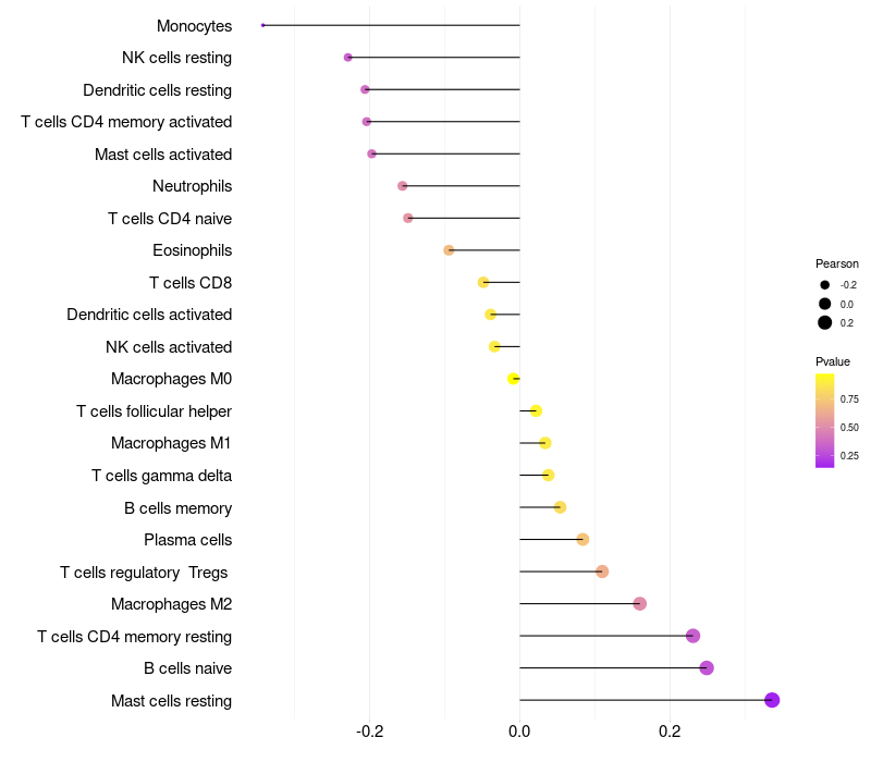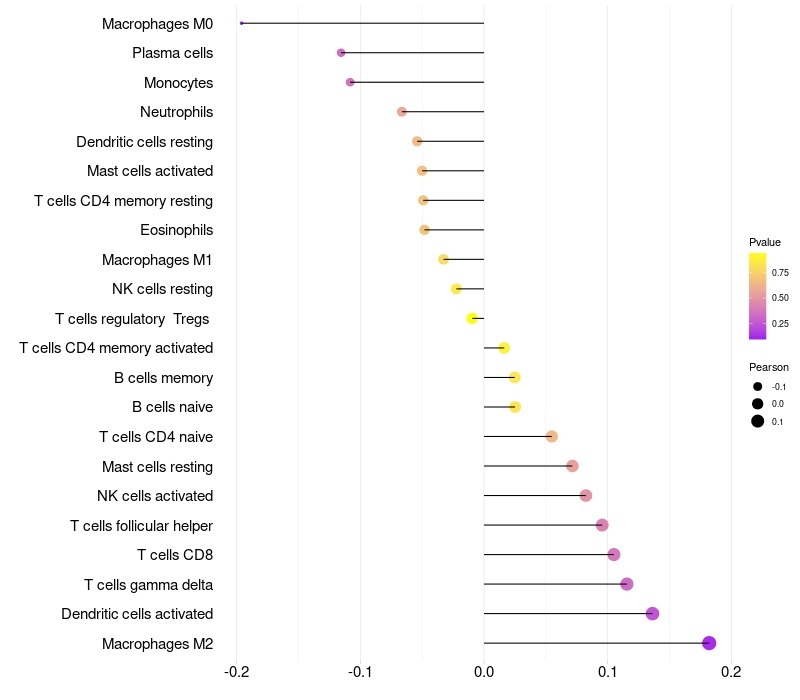 Lollipop of PCDH8 expression and immune infiltrating cell level correlation result in HPV+ samples