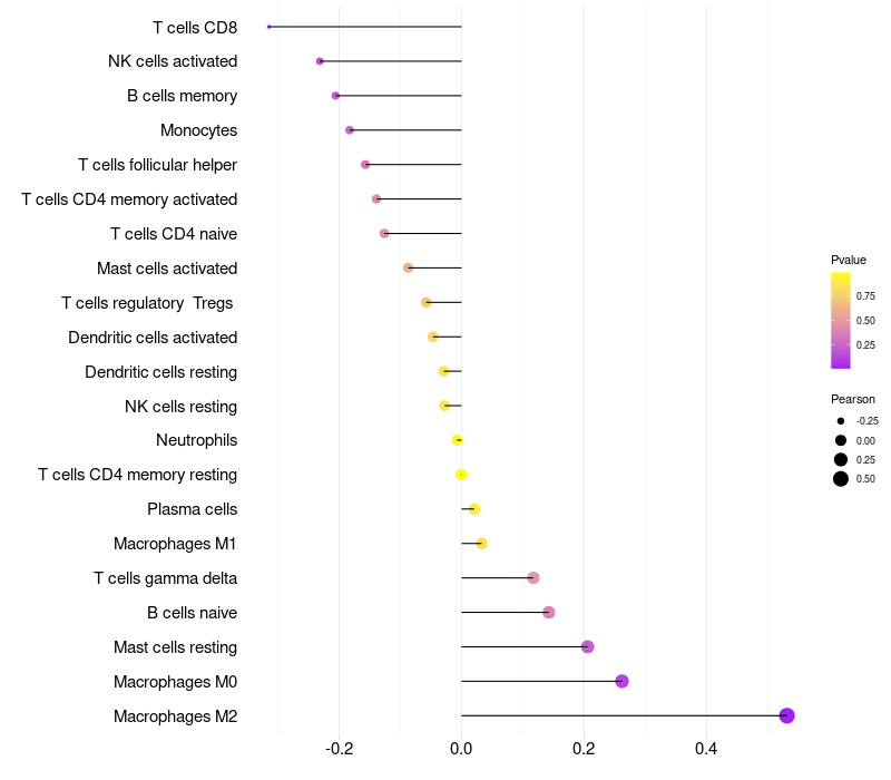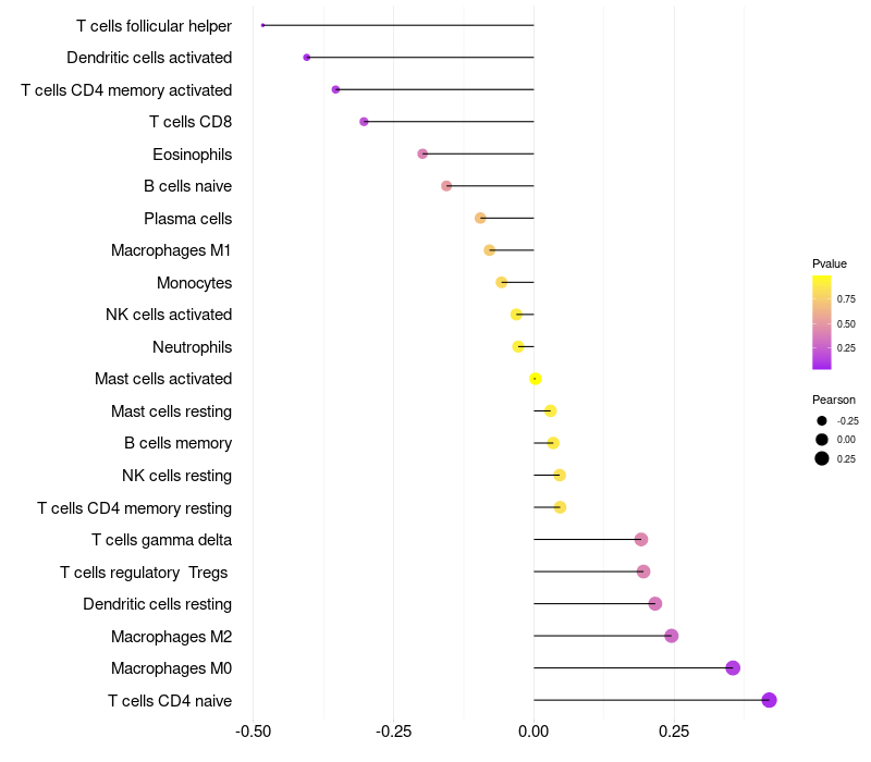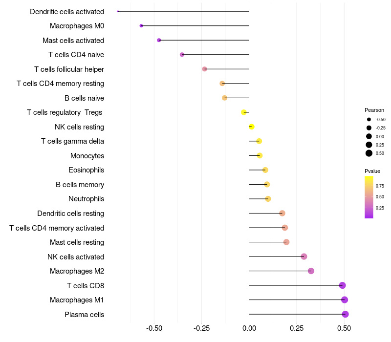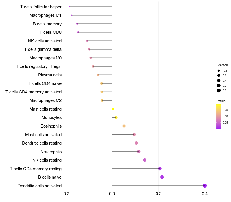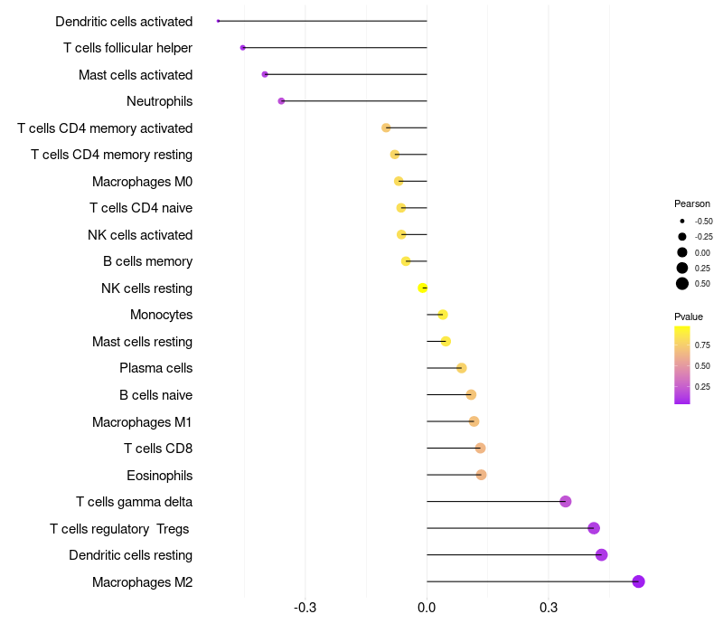 Lollipop of PCDHB15 expression and immune infiltrating cell level correlation result in HPV+ samples