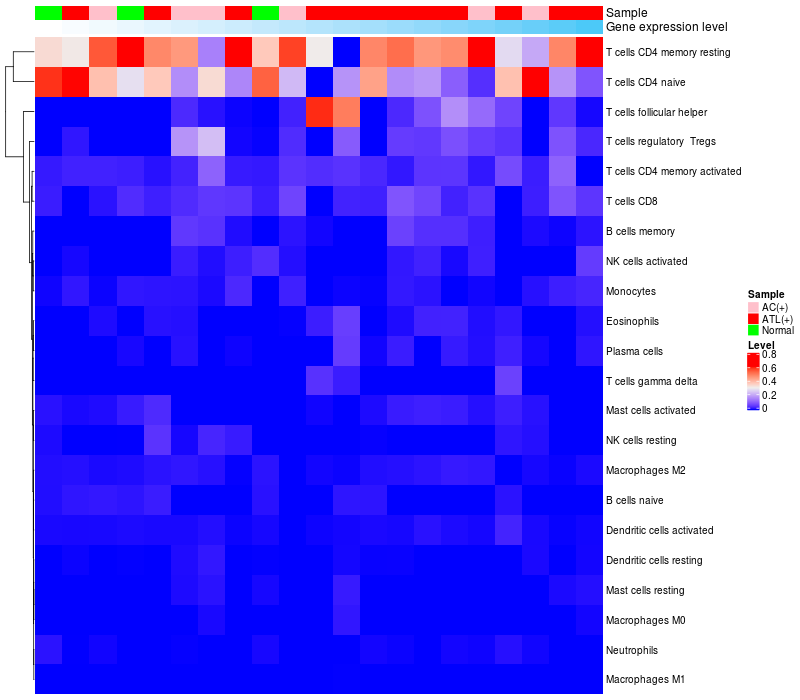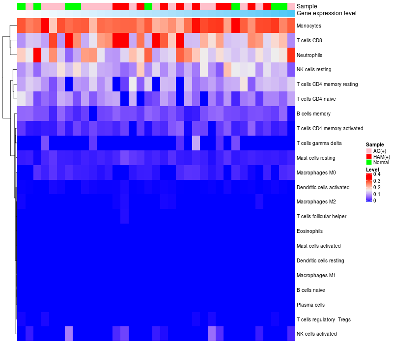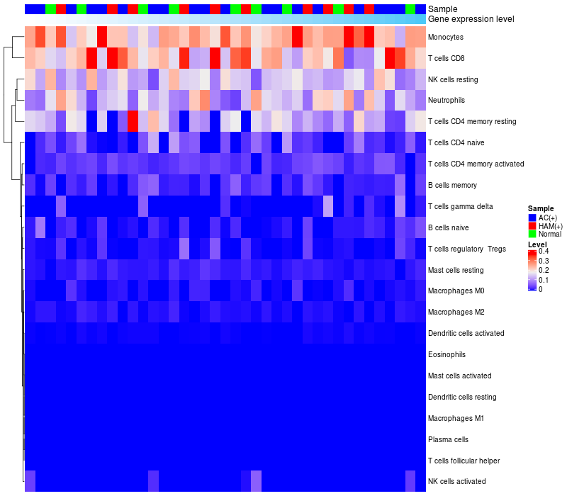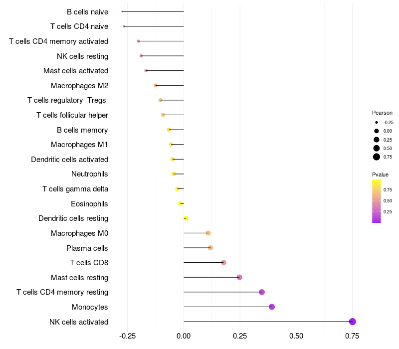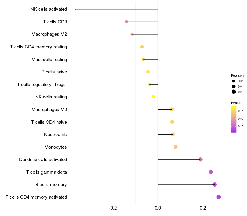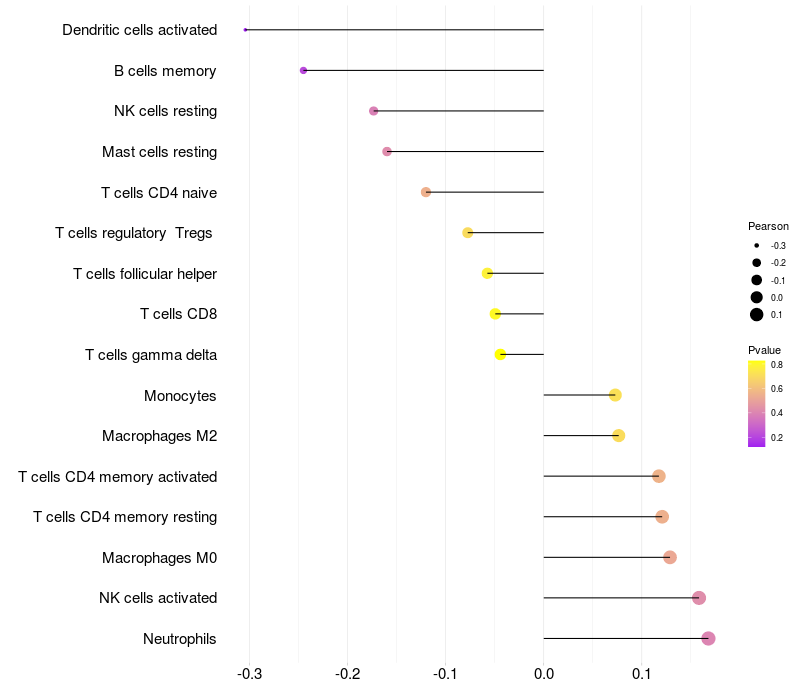 Lollipop of PCGF2 expression and immune infiltrating cell level correlation result in HTLV1+ samples