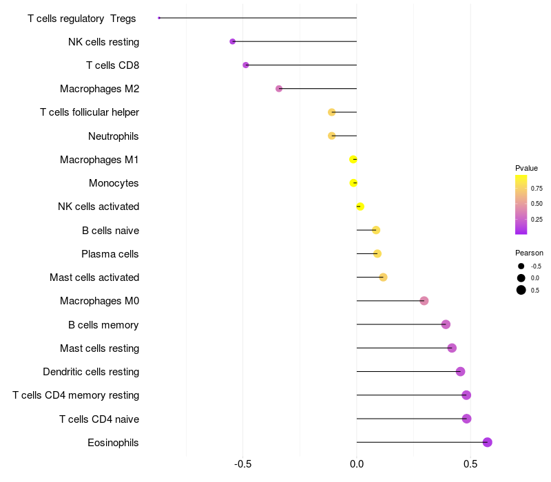 Lollipop of PCK2 expression and immune infiltrating cell level correlation result in HBV+ Liver cirrhosis samples