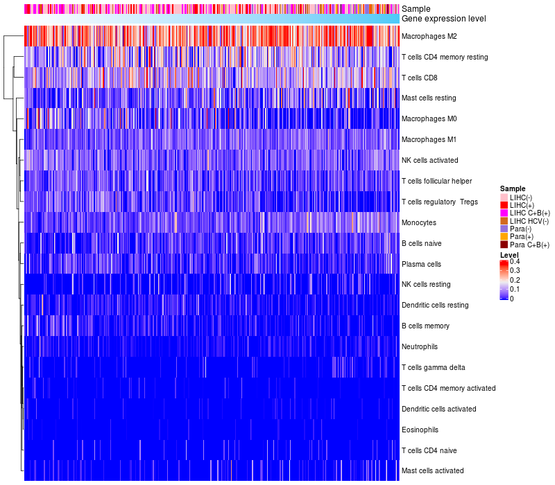 Liver hepatocellular carcinoma HCV (HBV+)(86), Liver hepatocellular carcinoma HCV (HBV-)(19), Liver hepatocellular carcinoma (HBV+)(209), Liver hepatocellular carcinoma (HBV+)(60), Paracancerous HCV (HBV+)(4), Paracancerous (HBV-)(28), Paracancerous (HBV+)(18) |