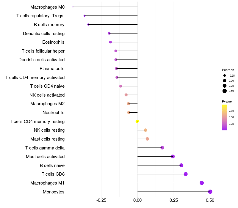 Lollipop of PCK2 expression and immune infiltrating cell level correlation result in HBV+ Hepatocellular carcinoma samples