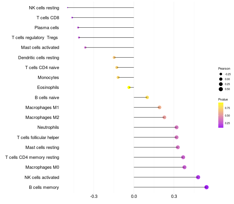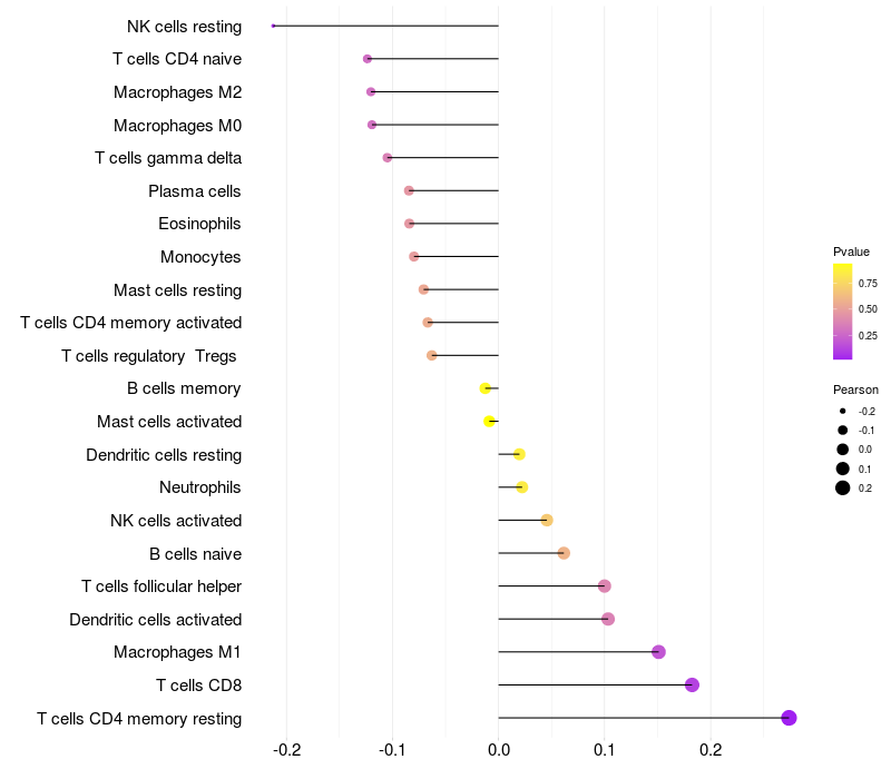 Lollipop of PCMTD2 expression and immune infiltrating cell level correlation result in HBV+ Liver cirrhosis samples