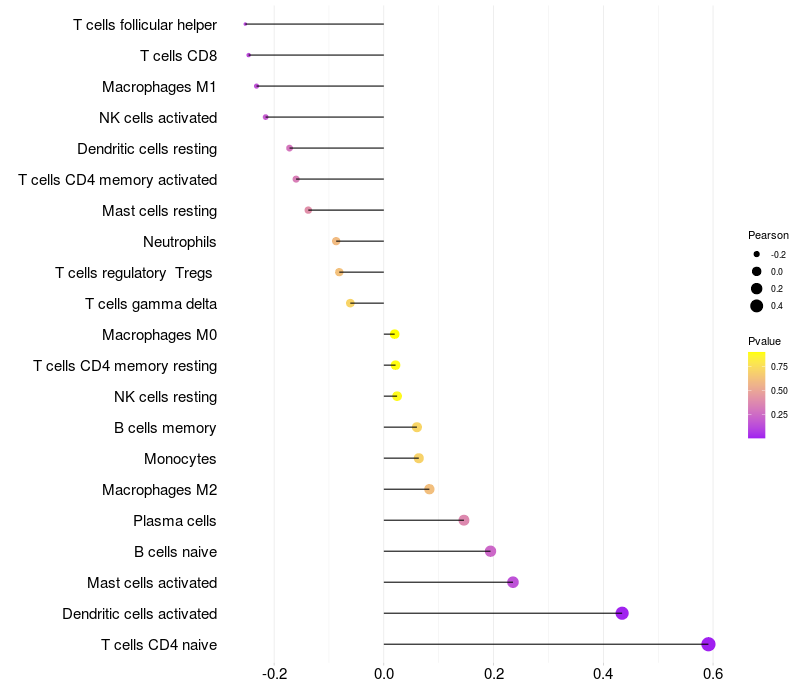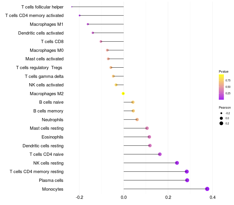 Lollipop of PCP4 expression and immune infiltrating cell level correlation result in HPV+ samples