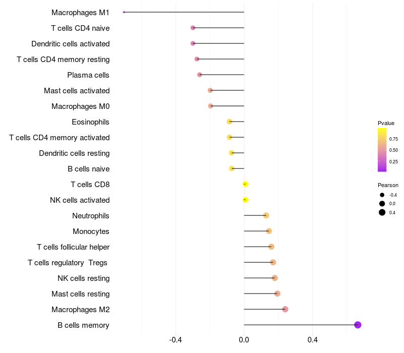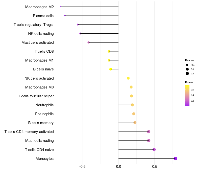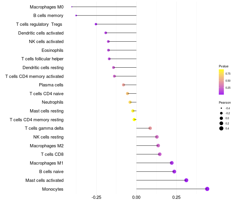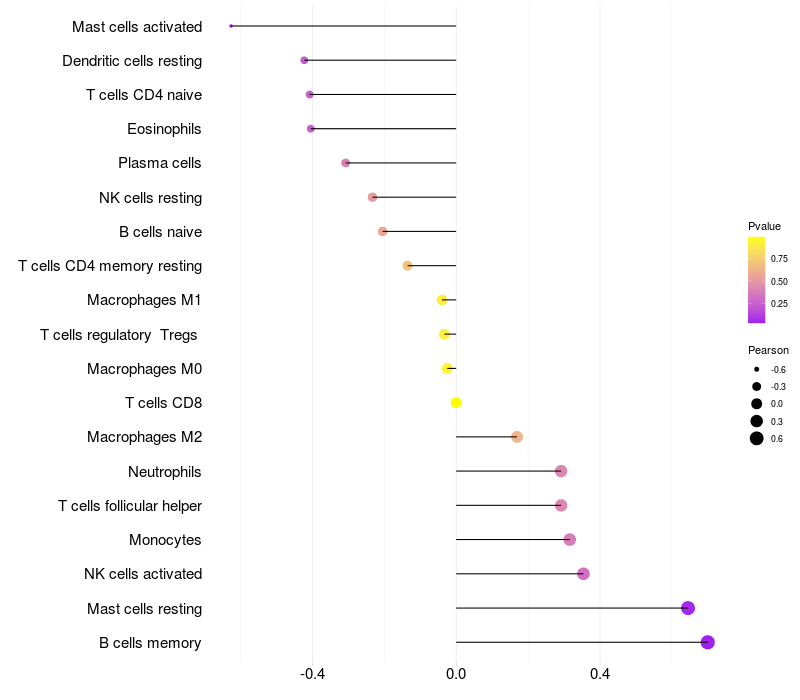 Lollipop of PCTP expression and immune infiltrating cell level correlation result in HBV+ Liver cirrhosis samples