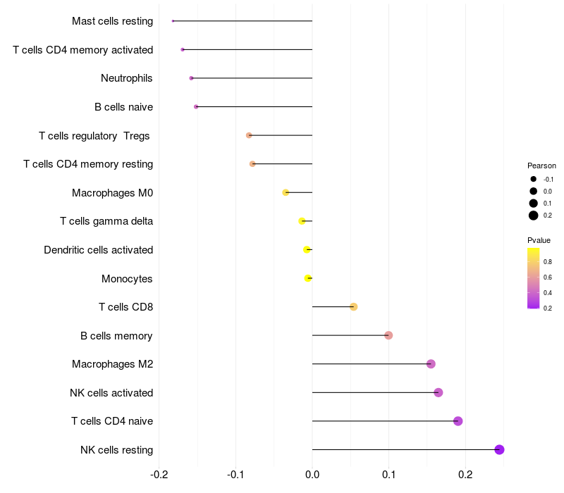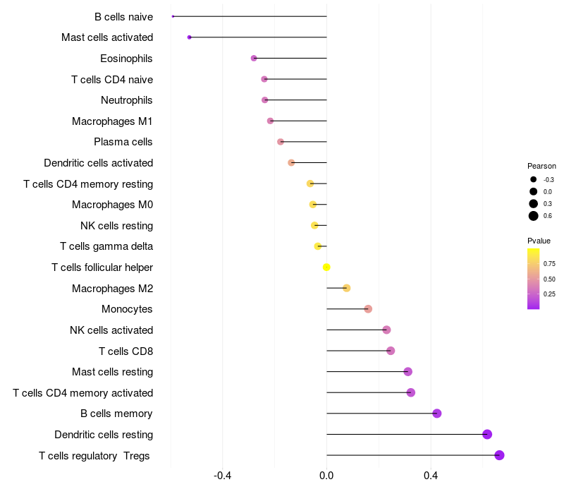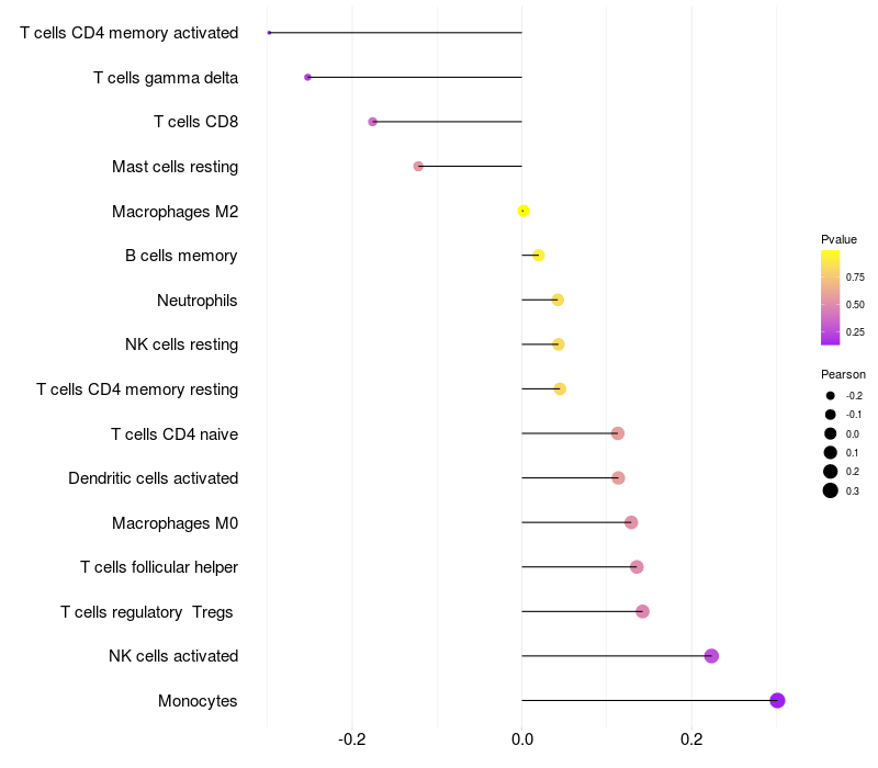 Lollipop of PCYT1A expression and immune infiltrating cell level correlation result in HTLV1+ samples